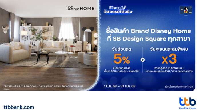 ทีเอ็มบีธนชาต หรือ ทีทีบี มอบสิทธิประโยชน์ความคุ้มค่า 2 ต่อ เพื่อตอบโจทย์คนรักดิสนีย์ และผู้ที่ต้องการของแต่งบ้านที่ทันสมัยให้กับผู้ถือบัตรเครดิต ttb Disney กับสินค้า Brand Disney Home ที่ SB Design Square ทุกสาขา โดยความคุ้มค่าที่ 1 รับส่วนลด 5% ทุกชิ้น เมื่อมียอดใช้จ่ายแบบชำระเต็มจำนวน ตั้งแต่ 500 บาทขึ้นไป / เซลล์สลิป (ซื้อสินค้าผ่านออนไลน์ไม่เข้าร่วมรายการ) ความคุ้มค่าที่ 2 รับคะแนนสะสมพิเศษ X3 จำกัดการรับคะแนนสะสมพิเศษสูงสุดไม่เกิน 15,000 คะแนน / ท่าน (รวมคะแนนสะสมปกติ) ตั้งแต่วันที่ 1 มิถุนายน 2568 – 31 สิงหาคม 2568 ศึกษารายละเอียดเพิ่มเติมของโปรโมชัน ได้ที่ https://www.ttbbank.com/th/promotion/detail/ttb-disney-sbds-jun25