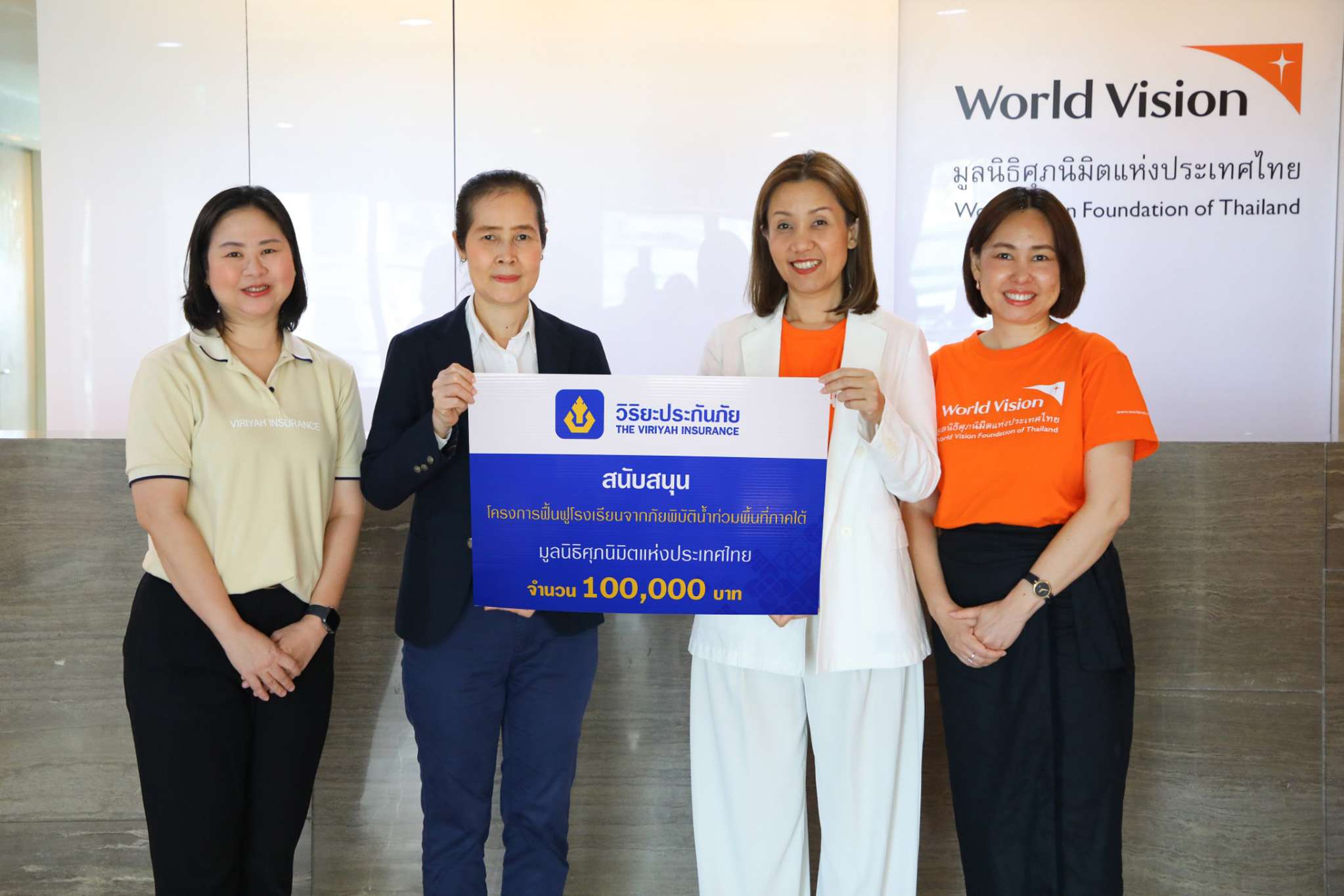 นางรสลิน โกแวร์ ผู้อำนวยการมูลนิธิศุภนิมิตแห่งประเทศไทย (World Vision Foundation of Thailand) รับมอบงบประมาณจำนวน 100,000 บาท จาก บริษัท วิริยะประกันภัย จำกัด (มหาชน) โดย นางชลทิชา สัตยมานะ ผู้ช่วยผู้จัดการฝ่ายสื่อสารองค์กร เป็นผู้แทนมอบ ภายใต้ “โครงการฟื้นฟูโรงเรียนที่ได้รับผลกระทบจากน้ำท่วมภาคใต้” ซึ่งงบประมาณดังกล่าว จะถูกนำไปสนับสนุนการจัดซื้อจัดหาครุภัณฑ์และอุปกรณ์การเรียนการสอนให้กับโรงเรียนบ้านศรีพงัน อ.ตากใบ จ.นราธิวาส และโรงเรียนบ้านม่วงถ้ำ อ.เทพา จ.สงขลา เพื่อสนับสนุนการปรับปรุงซ่อมแซมห้องเรียนที่ได้รับความเสียหายจากภัยพิบัติน้ำท่วมรุนแรง ให้กลับมาสู่สภาพที่พร้อมสำหรับการจัดการเรียนการสอนได้อย่างปกติ โดยพิธีมอบจัดขึ้น ณ มูลนิธิศุภนิมิตแห่งประเทศไทย แขวงสามเสนนอก เขตห้วยขวาง กรุงเทพฯ