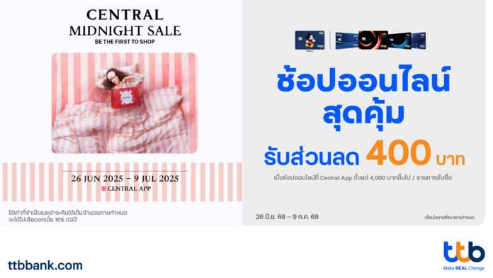 ทีเอ็มบีธนชาต หรือ ทีทีบี จัดแคมเปญสุดพิเศษ “Central App Midnight Sale” เอาใจสายช้อปออนไลน์โดยเฉพาะ มอบสิทธิประโยชน์สำหรับผู้ถือบัตรเครดิต ttb บัตรเครดิต ttb Global House และบัตรเครดิต ttb Disney รับส่วนลดมูลค่า 400 บาท เมื่อมียอดสั่งซื้อเฉพาะสินค้าที่มีรหัสสินค้าขึ้นต้นด้วย CDS ผ่าน Central App ตั้งแต่ 4,000 บาทขึ้นไปต่อรายการสั่งซื้อ จำกัดจำนวนเพียง 100 สิทธิ์ตลอดรายการ ตั้งแต่วันที่ 26 มิถุนายน 2568 – 9 กรกฎาคม 2568 ศึกษารายละเอียดเพิ่มเติมของโปรโมชัน ได้ที่ https://www.ttbbank.com/th/promotion/detail/centralapp-jun25