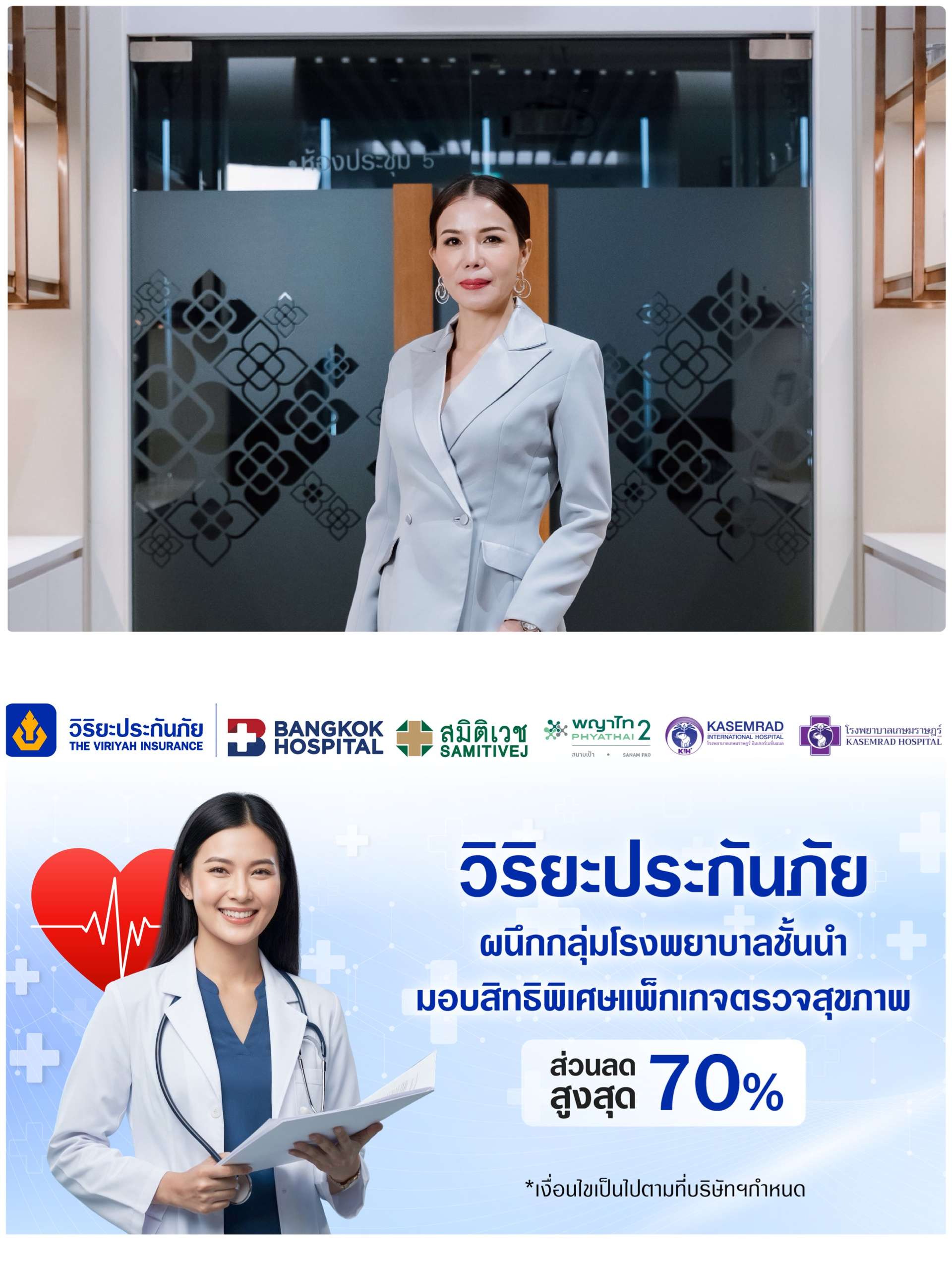 บริษัท วิริยะประกันภัย จำกัด (มหาชน) ผู้นำอันดับหนึ่งแห่งธุรกิจประกันภัยของไทย ตอกย้ำวิสัยทัศน์ในการดูแลลูกค้าอย่างรอบด้าน ทั้งลูกค้าประกันรถยนต์ ประกันสุขภาพ และประกันอุบัติเหตุ ด้วยการจับมือกับผู้นำด้านบริการสุขภาพชั้นนำ ได้แก่ โรงพยาบาลกรุงเทพ ซอยศูนย์วิจัย โรงพยาบาลสมิติเวช โรงพยาบาลพญาไท 2 และโรงพยาบาลในเครือเกษมราษฎร์ มอบสิทธิพิเศษสุดเอ็กซ์คลูซีฟสำหรับลูกค้าวิริยะประกันภัยโดยเฉพาะ ให้สามารถซื้อแพ็กเกจตรวจสุขภาพในราคาพิเศษลดสูงสุดกว่า 70% ในการผนึกกำลังครั้งนี้ แสดงถึงความมุ่งมั่นของวิริยะประกันภัยที่ให้ความสำคัญกับสุขภาพที่ดีของลูกค้า ซึ่งเป็นหัวใจสำคัญในการดำเนินงาน