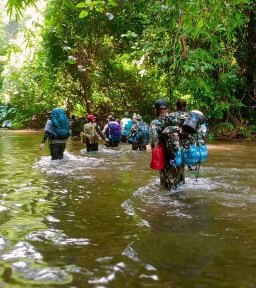 การเดินทางเริ่มต้นจากจุดที่รถสามารถเข้าถึง ก่อนเปลี่ยนมาเป็นเส้นทางเดินเท้าผ่านป่าดิบชื้น ความยาวประมาณ 8 กิโลเมตร ตลอดเส้นทาง นักเดินป่าจะได้สัมผัสความสมบูรณ์ของธรรมชาติทั้งไม้ยืนต้นนานาพันธุ์ สัตว์ป่าน้อยใหญ่ และลำธารสายเล็กที่ต้องข้ามถึง 12 จุด