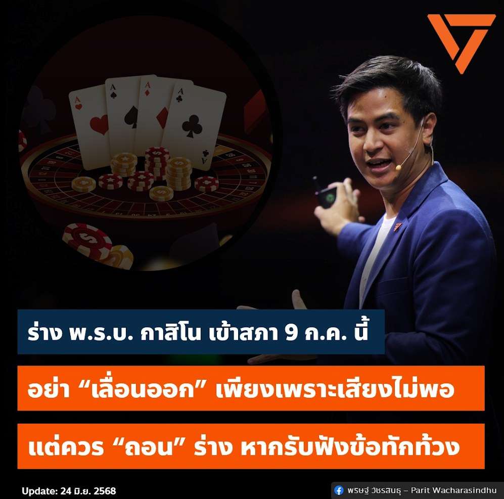 กรุงเทพฯ วันที่ 2 ก.ค. “ไอติม” พริษฐ์ วัชรสินธุ สส.บัญชีรายชื่อ และโฆษก พรรคประชาชน กล่าวถึงร่างกฎหมายกาสิโนว่า ท่ามกลางหลายเหตุการณ์ทางการเมืองที่เกิดขึ้นเมื่อวาน หนึ่งเหตุการณ์ที่ไม่ได้เกิดขึ้น คือที่ประชุม ครม. ไม่ได้มีมติ ขอถอนร่าง พ.ร.บ. สถานบันเทิงครบวงจร (กาสิโน) ออกจากระเบียบวาระการประชุมสภา ซึ่งขอยืนยันว่าตนและพรรคประชาชนไม่เห็นด้วยกับนโยบายและกฎหมายของรัฐบาล เนื่องจาก ประโยชน์ทางเศรษฐกิจยังไม่ชัดเจนและขาดผลการศึกษาที่รอบคอบและสอดคล้องกับร่างกฎหมาย ขณะที่ ผลกระทบทางสังคมยังขาดมาตรการป้องกันที่รัดกุมเพียงพอและถูกรับประกันในตัวบทกฎหมาย และกระบวนการขับเคลื่อนนโยบายที่ผ่านมาขาดความตรงไปตรงมาและความคงเส้นคงวา