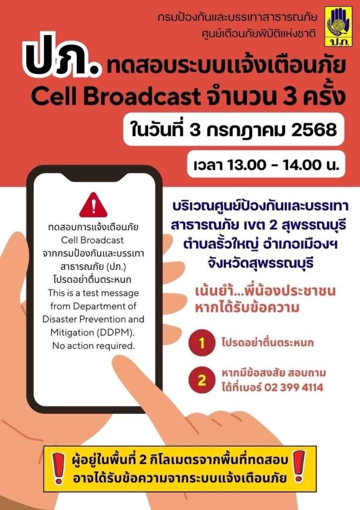 วันที่ 3 ก.ค. 68 กรมป้องกันและบรรเทาสาธารณภัย (ปภ.) ออกประกาศแจ้งว่าได้กำหนดการทดสอบระบบแจ้งเตือนภัยผ่านสัญญาณโทรศัพท์เคลื่อนที่ (Cell Broadcast) บริเวณศูนย์ป้องกันและบรรเทาสาสาธารณภัยเขต 2สุพรรณบุรี ตำบลรั้วใหญ่ อำเภอเมืองสุพรรณบุรี จังหวัดสุพรรณบุรี ระหว่าง เวลา 13.00 – 14.00 น. โดยการทดสอบในครั้งนี้จะเป็นการทดสอบระบบการแจ้งเตือนภัยผ่านสัญญาณโทรศัพท์เคลื่อนที่ระหว่าง Cell Broadcast Entity (CBE) และ Cell Broadcast Center (CBC) ในพื้นที่เป้าหมายตามโครงการพัฒนาระบบแจ้งเตือนภัย ในบริเวณพื้นที่ศูนย์ป้องกันและบรรเทาสาสาธารณภัยเขต 2 สุพรรณบุรี จำนวน 3 ครั้ง 3 ประเภทเหตุการณ์