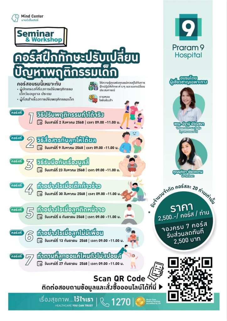 นอกจากนี้ พญ.ปราณี กล่าวว่า สำหรับพ่อแม่ผู้ปกครองที่ต้องการเข้าใจพฤติกรรมบุตรหลาน และต้องการปรับเปลี่ยนพฤติกรรมที่เป็นปัญหาให้ดีขึ้น หลังจากที่ลองใช้หลายวิธีการแล้วยังไม่สำเร็จ ทางรพ.พระราม 9 ยังได้จัดเวิร์คช้อปเกี่ยวกับการปรับพฤติกรรมเด็ก เป็นปัญหาพฤติกรรมที่พบได้บ่อย โดยเทคนิคในการเวิร์คช้อปจะเป็นแบบมีการปฏิสัมพันธ์ระหว่างวิทยากรกับผู้อบรม (interactive) มีการแบ่งกลุ่ม เรียนรู้เทคนิค ฝึกทักษะทดลองทำจริง ไม่ว่าจะเป็น กรณีศึกษา (case study) หรือการแชร์ประสบการณ์ การทำแบบฝึกหัดในชั่วโมงเรียน มีการบ้านให้ฝึกต่อเนื่อง โดยคอร์สนี้รับเพียง 20 ท่าน เพื่อให้เกิดประสิทธิภาพสูงสุด พ่อแม่ผู้ปกครองที่สนใจสามารถติดต่อสอบถามหรือสมัครได้ผ่าน QR code ด้านล่าง