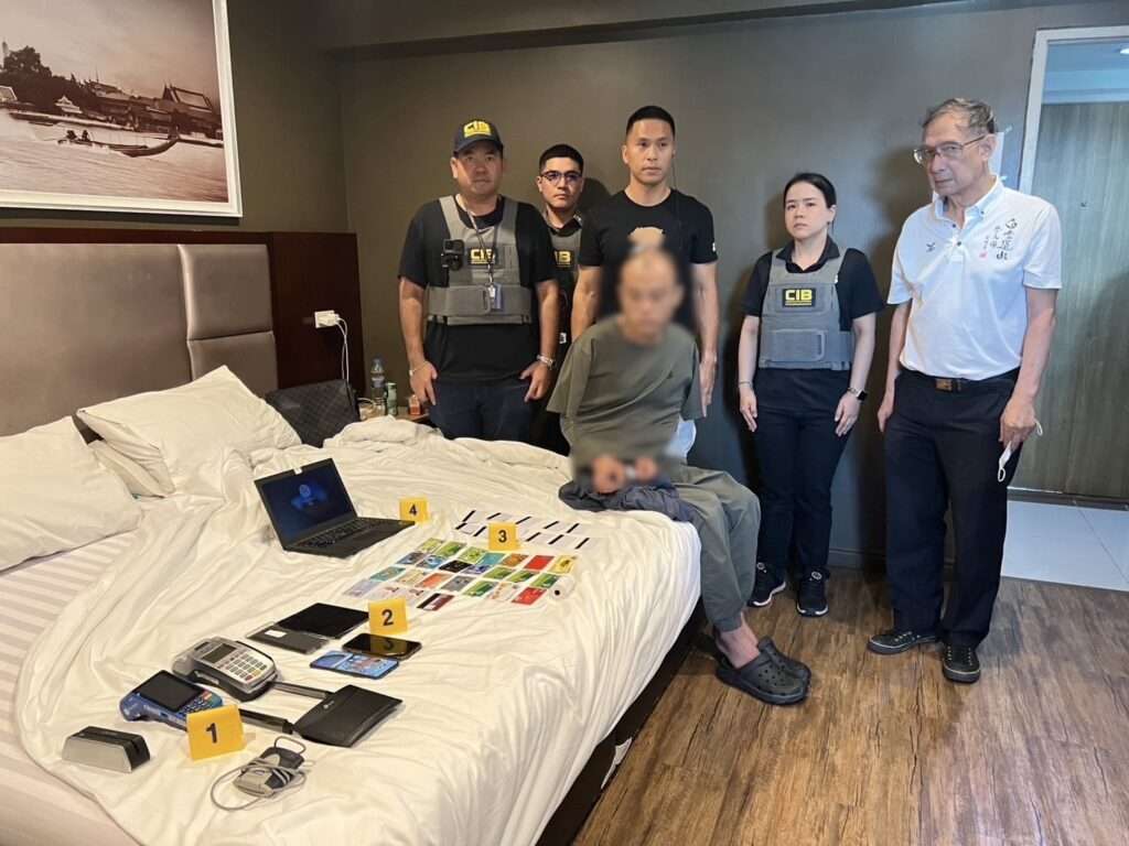 เจ้าหน้าที่ตำรวจ กก.3 บก.ปอท. จึงได้ทำการสืบสวนและพิสูจน์ทราบบุคคล พบว่าผู้ที่ทำรายการคือ นายหม่าฯ (Mr.MA) อายุ 35 ปี สัญชาติจีน และพักอาศัยอยู่ที่ โรงแรมแห่งหนึ่ง ย่านสุทธิสาร เจ้าหน้าที่ตำรวจ จึงได้รวบรวมพยานหลักฐานขออนุมัติหมายจับ และเข้าจับกุมตัว นายหม่าฯ (MR.MA) ได้ที่ห้องพักในโรงแรมดังกล่าว พร้อมของกลาง ได้แก่ เครื่อง EDC หรือเครื่องสำหรับรับชำระเงินด้วยบัตร จำนวน 2 เครื่อง, เครื่องอ่านบัตร จำนวน 2 เครื่อง, โทรศัพท์มือถือ จำนวน 3 เครื่อง, บัตร ATM ธนาคารต่างชาติ จำนวน 17 ใบ, บัตร PVC เปล่า จำนวน 11 ใบ และคอมพิวเตอร์โน้ตบุ๊ค จำนวน 1 เครื่อง และควบคุมตัวส่งพนักงานสอบสวน กก.3 บก.ปอท. เพื่อดำเนินคดีตามกฎหมายต่อไป