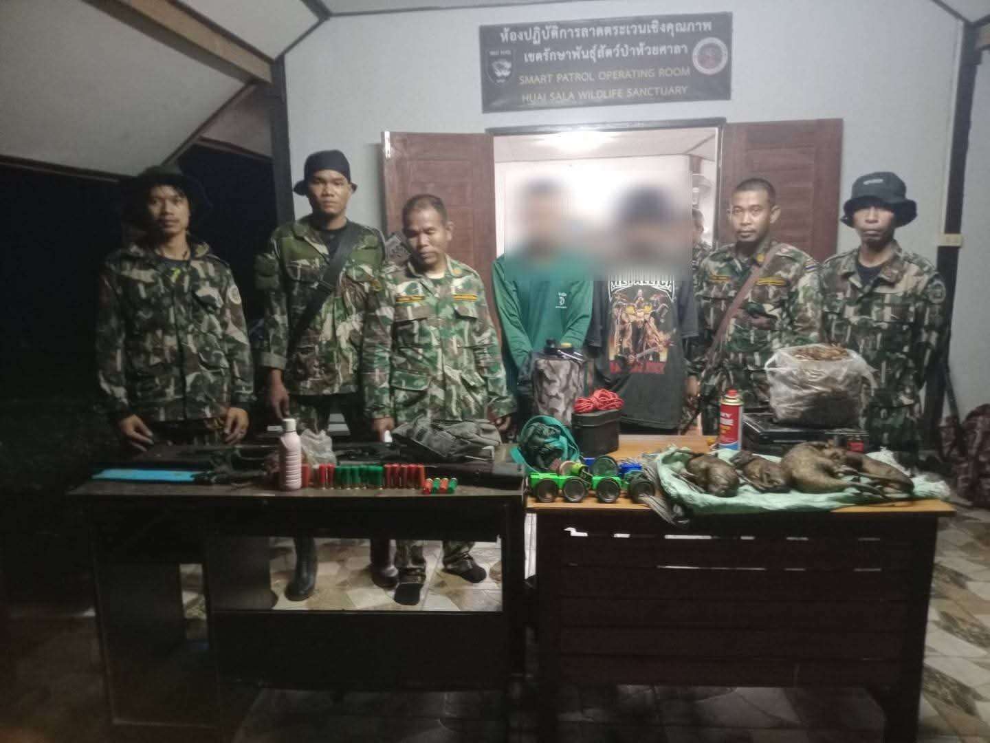 จากการตรวจสอบและตรวจค้น เจ้าหน้าที่พบของกลางสำคัญที่ใช้ในการกระทำผิดและซากสัตว์ป่าคุ้มครอง ซากกระจงหนู จำนวน 2 ซาก ซากเม่นใหญ่ จำนวน 1 ซาก ซากหมาไม้ จำนวน 1 ซาก และอุปกรณ์ที่ใช้ในการกระทำผิด ประกอบด้วย อาวุธปืนลูกซอง จำนวน 1 กระบอก อาวุธปืนแก๊ปยาวแบบประจุปาก จำนวน 1 กระบอก พร้อมเครื่องกระสุนปืนกระสุนปืนลูกซอง ขนาด 12 เกจ จำนวน 15 นัด ปลอกกระสุนปืนลูกซอง ขนาด 12 เกจ จำนวน 4 ปลอก มีด 1 ด้าม และอุปกรณ์กระทำผิดอีกจำนวนหนึ่ง