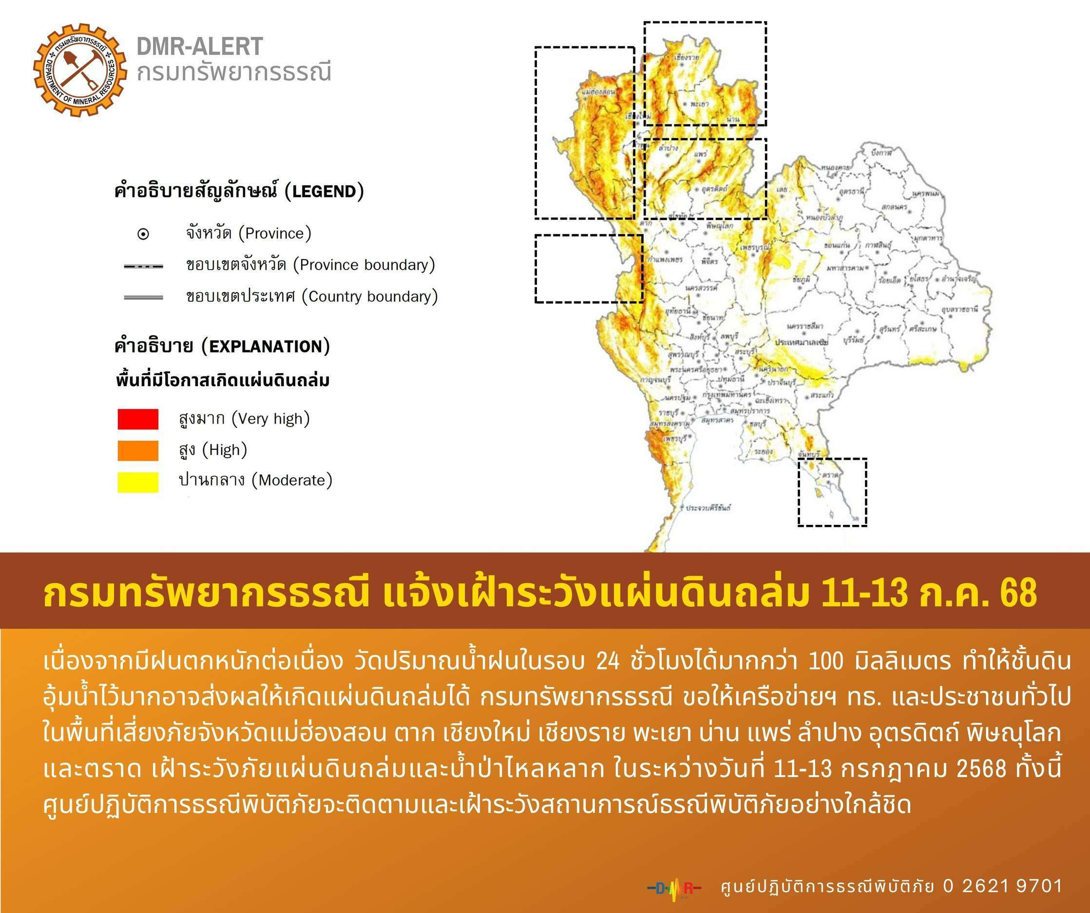 วันที่ 11 ก.ค.กรมทรัพยากรธรณี กระทรวงทรัพยากรธรรมชาติและสิ่งแวดล้อม ขอให้อาสาสมัครเครือข่ายในพื้นที่จังหวัดแม่ฮ่องสอน ตาก เชียงใหม่ เชียงราย พะเยา น่าน แพร่ ลำปาง อุตรดิตถ์ พิษณุโลก และตราด เฝ้าระวังภัยแผ่นดินถล่มและน้ำป่าไหลหลาก ในระหว่างวันที่ 11-13 กรกฎาคม 2568 และขอให้เครือข่ายฯ ทธ. วัดปริมาณน้ำฝนอย่างต่อเนื่อง ทั้งนี้ ศูนย์ปฏิบัติการธรณีพิบัติภัย จะติดตามสถานการณ์อย่างใกล้ชิด