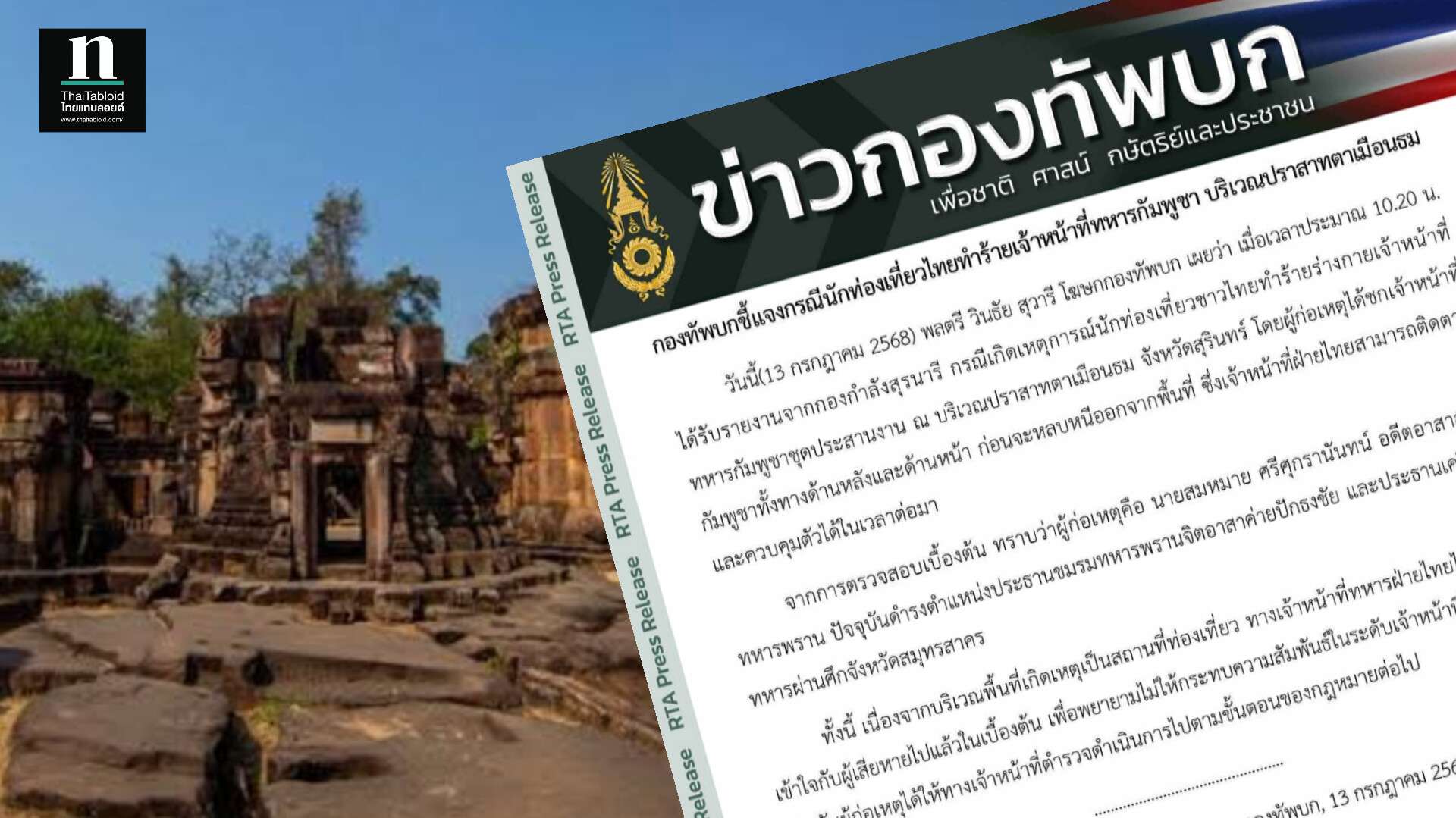 วันนี้(13 กรกฎาคม 2568) พลตรี วินธัย สุวารี โฆษกกองทัพบก เผยว่า เมื่อเวลาประมาณ 10.20 น.ได้รับรายงานจากกองกำลังสุรนารี กรณีเกิดเหตุการณ์นักท่องเที่ยวชาวไทยทำร้ายร่างกายเจ้าหน้าที่ทหารกัมพูชาชุดประสานงาน ณ บริเวณปราสาทตาเมือนธม จังหวัดสุรินทร์ โดยผู้ก่อเหตุได้ชกเจ้าหน้าที่กัมพูชาทั้งทางด้านหลังและด้านหน้า ก่อนจะหลบหนีออกจากพื้นที่ ซึ่งเจ้าหน้าที่ฝ่ายไทยสามารถติดตามและควบคุมตัวได้ในเวลาต่อมา