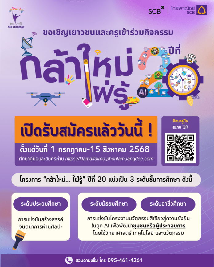 สถาบันการศึกษาที่สนใจ สามารถศึกษาคู่มือ เตรียมความพร้อม และสมัครได้ทางออนไลน์ผ่านเว็บไซต์ https://klamaifairoo.phonlamuangdee.com ตั้งแต่วันที่ 1 กรกฎาคม – 15สิงหาคม 2568 ติดตามรายละเอียดหรือสอบถามข้อมูลเพิ่มเติมได้ที่ โทร. 095-461-4261 หรือ Facebook : SCB Challenge “กล้าใหม่…ใฝ่รู้”
