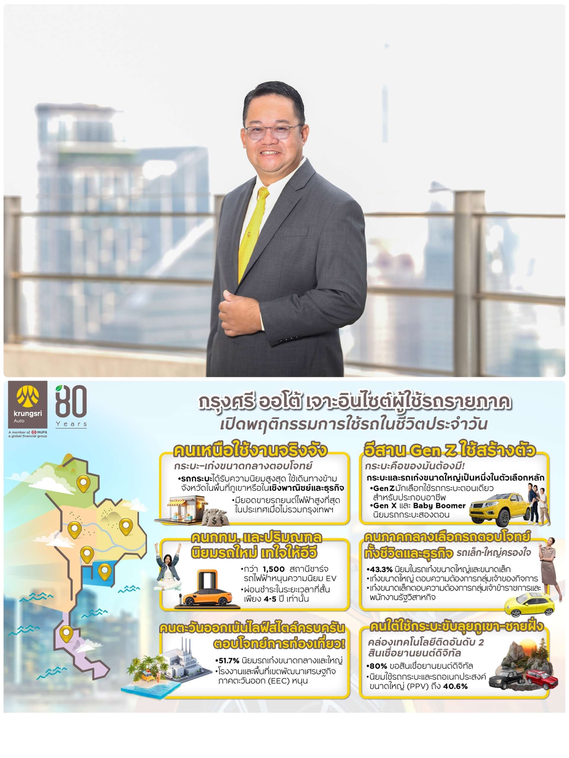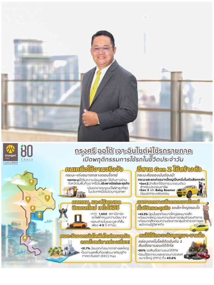 “กรุงศรี ออโต้” ผู้นำธุรกิจสินเชื่อยานยนต์ครบวงจร เครือธนาคารกรุงศรีอยุธยา จำกัด (มหาชน) เผยอินไซต์ผู้ใช้รถตามภูมิภาค อ้างอิงจากข้อมูลการขอสินเชื่อยานยนต์ ชี้กรุงเทพฯและปริมณฑล นำเทรนด์ใช้รถอีวี เน้นผ่อนสั้น-จบไว ภาคเหนือนิยมรถกระบะและรถเก๋งขนาดกลางเน้นความคุ้มค่าและความทนทาน ภาคอีสาน ใช้กระบะเป็นเครื่องมือสร้างรายได้ของคนทุกเจเนอเรชัน โดยเฉพาะกลุ่มวัยรุ่นสร้างตัว ขณะที่ภาคตะวันออกขับเคลื่อนด้วยรถเก๋งขนาดกลางและขนาดใหญ่ในเขตเมืองอุตฯ ส่วนภาคใต้ใช้กระบะฝ่าภูเขา–ชายฝั่ง พร้อมขึ้นแท่นภูมิภาคที่มีการใช้บริการสินเชื่อยานยนต์ดิจิทัลสูงเป็นอันดับสองของประเทศ