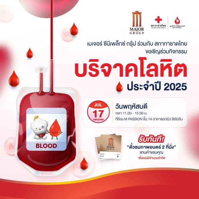 เมเจอร์ ซีนีเพล็กซ์ กรุ้ป ร่วมกับ ศูนย์บริการโลหิตแห่งชาติ สภากาชาดไทย จัดกิจกรรมบริจาคโลหิตเพื่อช่วยเหลือชีวิตเพื่อนมนุษย์อย่างต่อเนื่องทุก 3 เดือน ส่งเสริมการทำบุญด้วยการแบ่งปันและร่วมสนับสนุนการจัดหาโลหิตสำรองให้กับ สภากาชาดไทย นำไปใช้ในทางการแพทย์ทั้งในภาวะฉุกเฉินและรักษาผู้ป่วยที่มีความต้องการความช่วยเหลือเร่งด่วน ซึ่งปีนี้จัดขึ้นเป็นครั้งที่ 3 ชวนจิตอาสาร่วมทำบุญใหญ่ด้วยการร่วมบริจาคโลหิต ณ จุดรับบริจาคโลหิตในวันที่ 17 กรกฎาคม 2568 ตั้งแต่เวลา 11.00 – 15.00 น. ณ ห้อง M Passion ชั้น 14 อาคารอเวนิว เมเจอร์ ซีนีเพล็กซ์ รัชโยธิน มาร่วมกันเป็น “ผู้ให้” เพื่อส่งมอบพลังและโอกาสแด่เพื่อนมนุษย์ รับฟรีตั๋วหนัง 2 ที่นั่ง เป็นของที่ระลึกแทนคำขอบคุณ