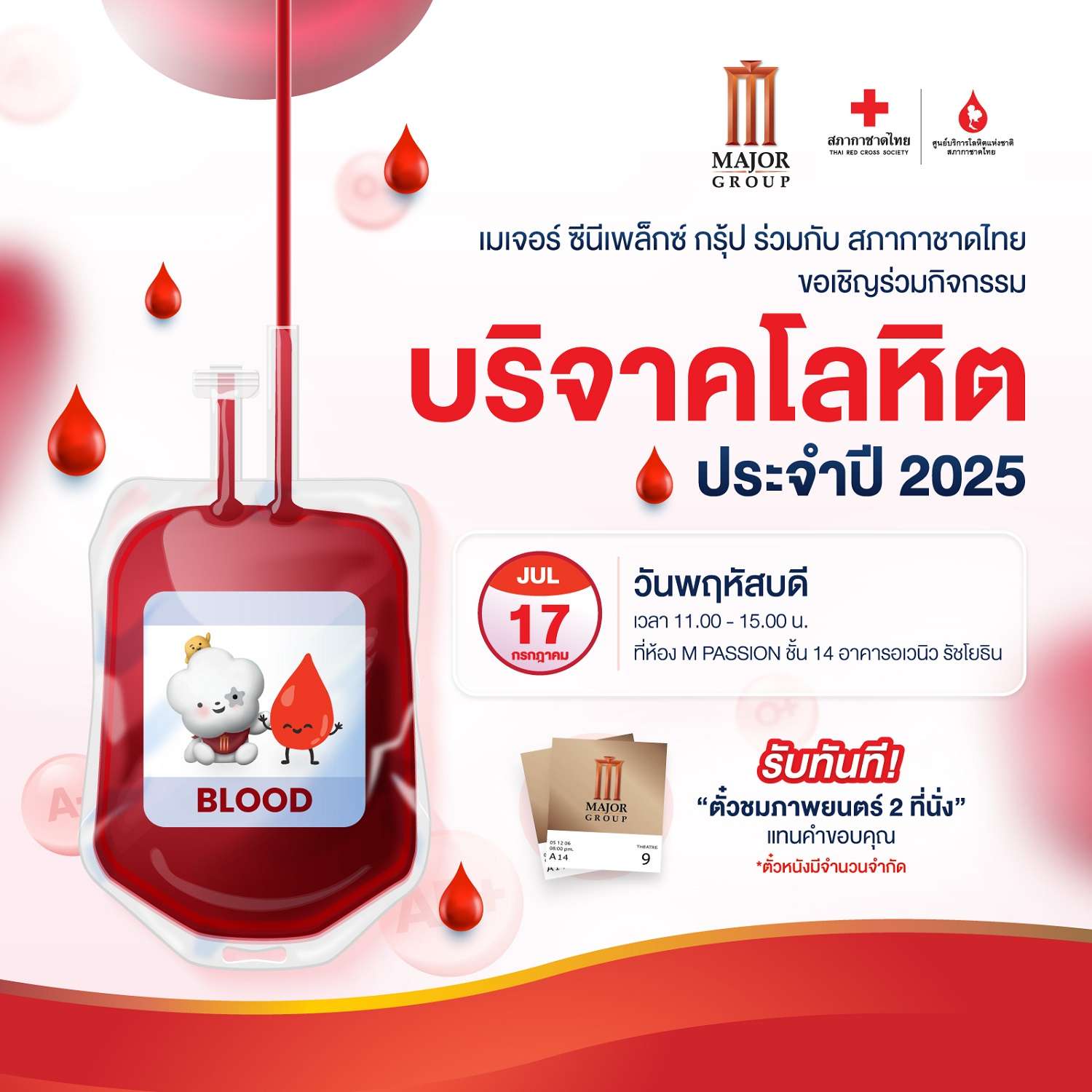 เมเจอร์ ซีนีเพล็กซ์ กรุ้ป ร่วมกับ สภากาชาดไทย เปิดจุดรับบริจาคโลหิตทุก 3 เดือน 17 กรกฎาคมนี้ ชวนจิตอาสาร่วมทำบุญใหญ่บริจาคโลหิต ที่เมเจอร์ ซีนีเพล็กซ์ รัชโยธิน รับฟรี! ตั๋วหนัง 2 ที่นั่ง แทนคำขอบคุณ