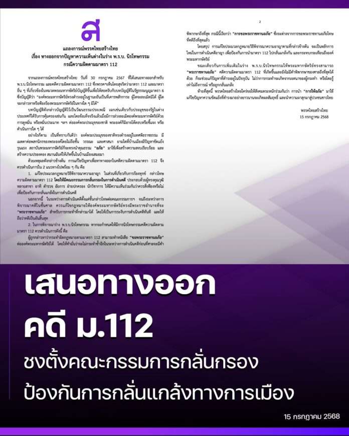 อย่างไรก็ตาม พรรคเห็นว่าในทางปฏิบัติที่ผ่านมาบางกรณี กฎหมายนี้อาจถูกนำไปใช้เพื่อกลั่นแกล้งหรือดำเนินคดีอย่างไม่เป็นธรรม ดังนั้น จึงเสนอ 2 แนวทางหลักในการแก้ปัญหาคดี ม.112 ควบคู่กัน ดังนี้