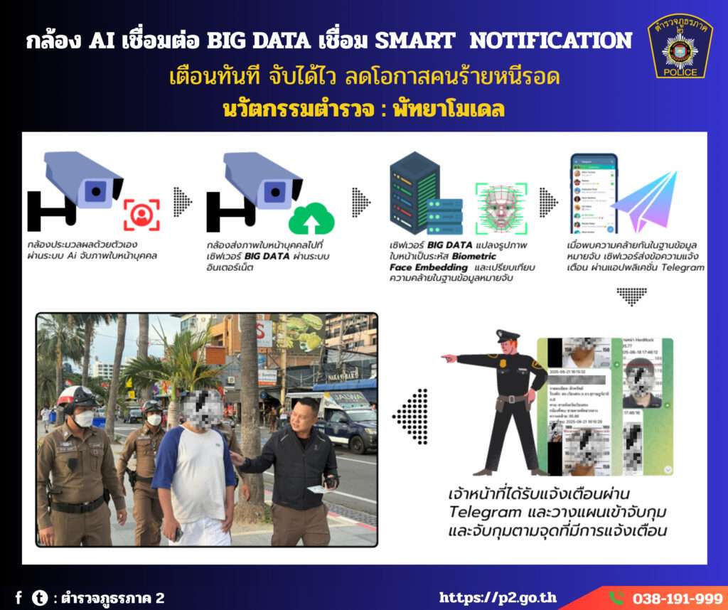 ผบช.ภ.2 กล่าวว่า เมื่อวันที่ 18 กรกฎาคม ที่ผ่านมา นายสรวงศ์ เทียนทอง รัฐมนตรีว่าการกระทรวงการท่องเที่ยวและกีฬา ลงพื้นที่วอล์กกิ้งสตรีทพัทยาเพื่อตรวจความพร้อมงานพัทยามาราธอน ตนจึงได้นำเสนอ “พัทยาโมเดล” ที่ใช้นวัตกรรมเทคโนโลยีขั้นสูงผ่านระบบ AI เชื่อมโยงบิ๊กดาต้า มาใช้ป้องกันและปราบปรามอาชญากรรม โดยรัฐมนตรีว่าการกระทรวงการท่องเที่ยวฯ ชื่นชมว่าเป็นก้าวสำคัญที่จะสร้างความเชื่อมั่นให้นักท่องเที่ยวกลับเข้ามาท่องเที่ยวในเมืองพัทยาเพิ่มมากขึ้น รวมถึงเมืองอื่น ๆ ในประเทศไทยด้วย