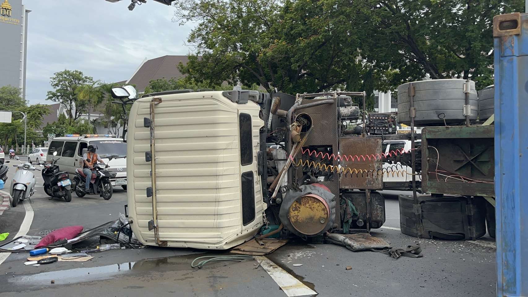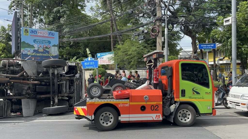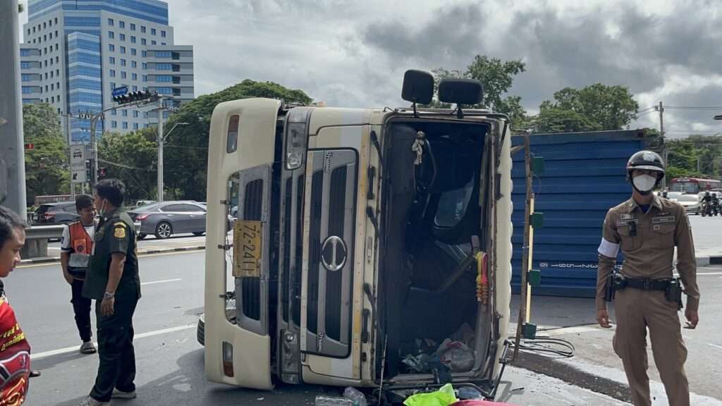 เมื่อเวลา 14.50 น. เจ้าหน้าที่รับแจ้งเกิดอุบัติเหตุ รถพ่วงบรรทุกตู้คอนเทนเนอร์ ทะเบียน 72 – 2411 กรุงเทพมหานคร ได้เสียหลักพลิกตะแคงบนบริเวณถนนแยกกรมศุลกากร มุ่งหน้าถนนอาจณรงค์ ขาออก