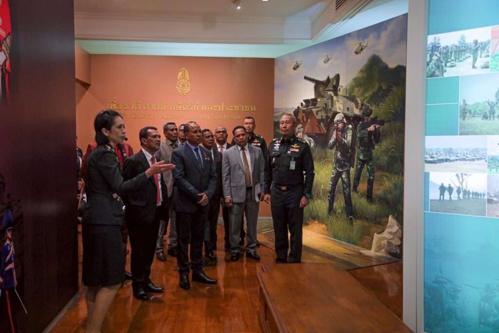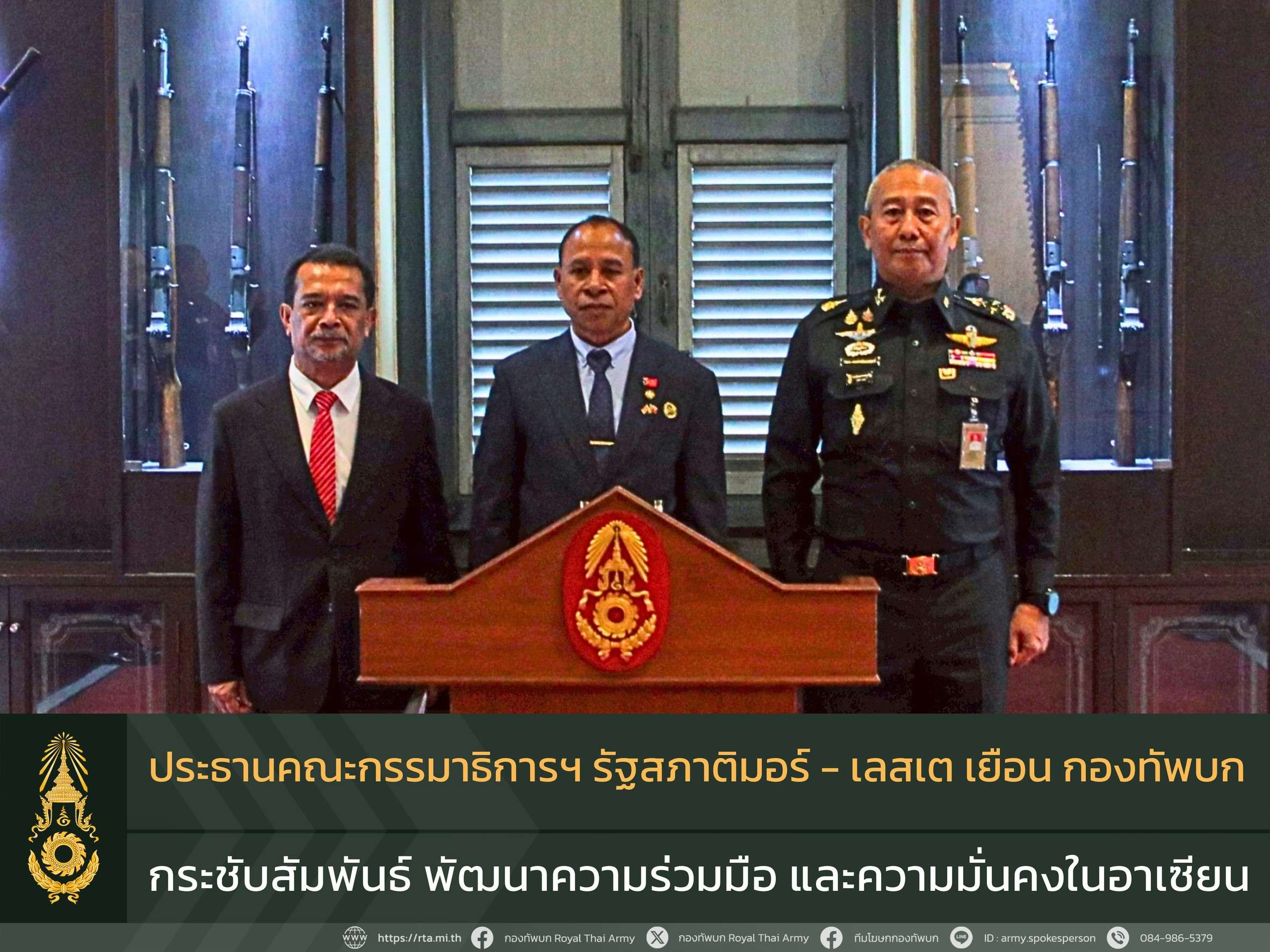 ในส่วนของกองทัพบก ผู้บัญชาการทหารบกได้กล่าวถึงความสัมพันธ์ทางการทูตที่ไทยมีกับติมอร์ – เลสเต ตลอด 23 ปี นับว่ามีประวัติศาสตร์และความสัมพันธ์ที่ดีต่อกันอย่างต่อเนื่องและยาวนาน โดยกองทัพบกไทยมีความยินดีในการสนับสนุนติมอร์ – เลสเต เข้าเป็นสมาชิกกลุ่มประเทศอาเซียน ลำดับที่ 11 พร้อมทั้งหารือเรื่องการขยายความร่วมมือในการแลกเปลี่ยนด้านข่าวกรองระหว่างกองทัพบกไทยกับกองทัพติมอร์ – เลสเต โดยเฉพาะประเด็นกลุ่มอาชญากรรมข้ามชาติในภูมิภาคเอเชียตะวันออกเฉียงใต้ เพื่อรองรับภัยคุกคามที่อาจเกิดขึ้นซึ่งถือเป็นความร่วมมือในการรักษาสันติภาพ ระหว่างประเทศ นอกจากนี้ ยังส่งเสริมในเรื่องของการฝึกร่วมระหว่างสองกองทัพ และเพิ่มเติมการแลกเปลี่ยนทางด้านการศึกษาให้มากขึ้น ในโอกาสนี้ ผู้บัญชาการทหารบกยังได้นำคณะกรรมาธิการฯ รัฐสภาติมอร์ – เลสเต เข้าเยี่ยมชมอาคารพิพิธภัณฑ์กองทัพบกเฉลิมพระเกียรติ กองบัญชาการกองทัพบก อีกด้วย