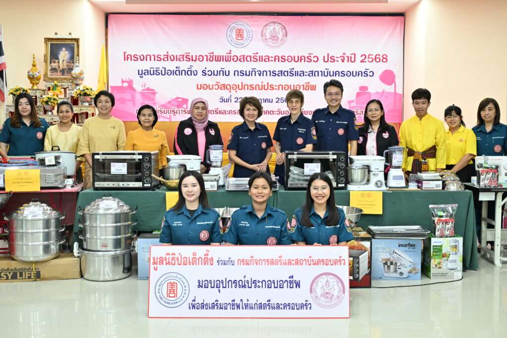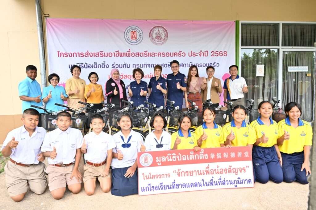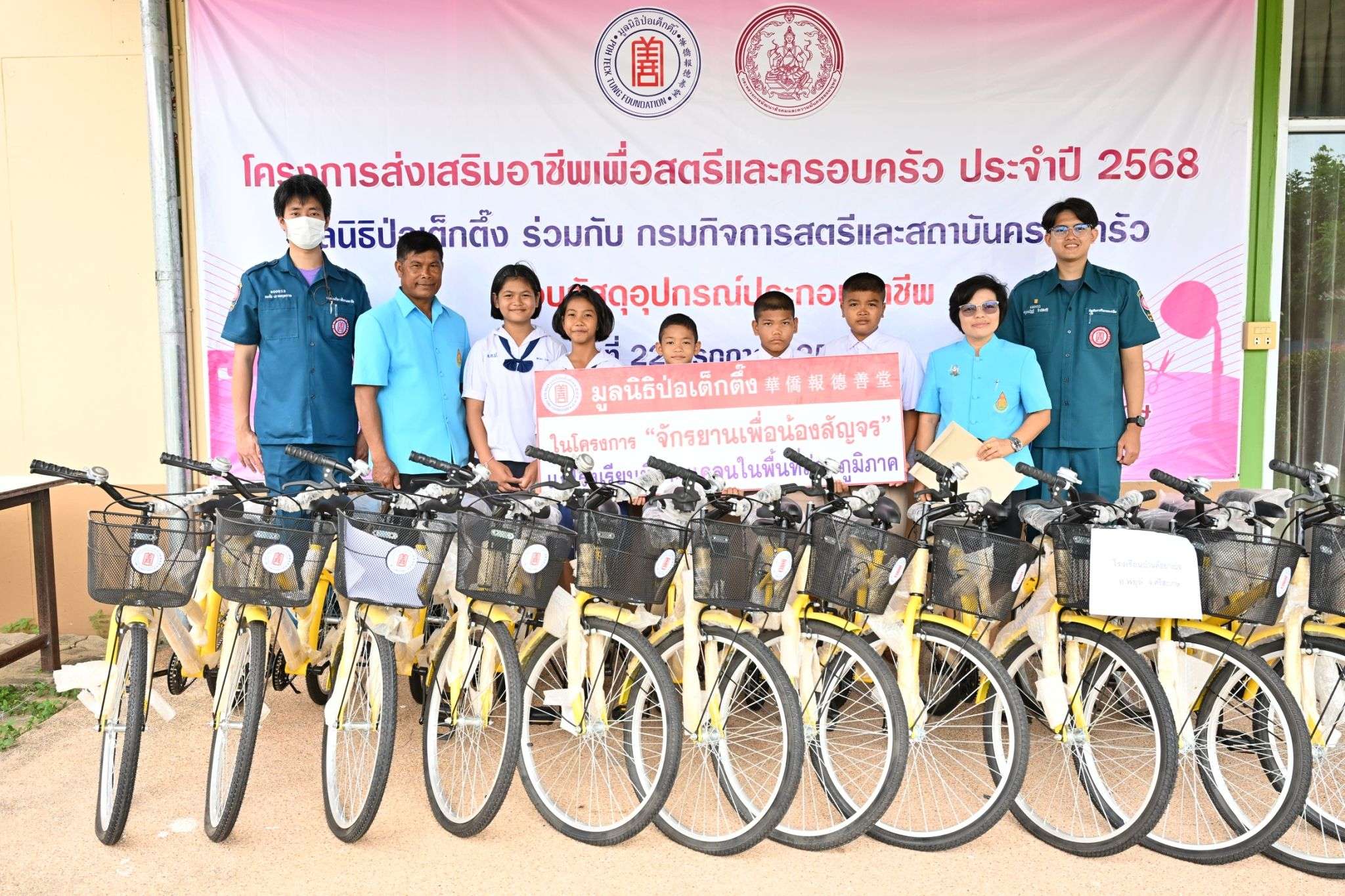 มูลนิธิป่อเต็กตึ๊ง นำโดย นางศิริกุล โอภาสวงศ์ กรรมการและเลขาธิการ พร้อมด้วย นายณัฐพร จาตุศรีพิทักษ์ ผู้ช่วยกรรมการ นางศิริพร กระจ่างหล้า ผู้จัดการฝ่ายสังคมสงเคราะห์ นางสาวดวงชุตา ติยะพจนพรกุล ผู้ช่วยผู้จัดการฝ่ายสังคมสงเคราะห์ นางสาวศุภรัตน์ สมบัติเจริญไทย หัวหน้าแผนกส่งเสริมการศึกษาและอาชีพ และนางสาวเนาวรัตน์ วรรณศิริ หัวหน้าแผนกหน่วยแพทย์สงเคราะห์ชุมชน นำทีมลงพื้นที่จังหวัดศรีสะเกษอีกครั้ง ระหว่างวันที่ 21-23 กรกฎาคม 2568 เพื่อมอบวัสดุอุปกรณ์ประกอบอาชีพแก่ สตรี บุรุษ พ่อเลี้ยงเดี่ยว หรือผู้ที่มีความหลากหลายทางเพศ ที่มีความรู้และความสามารถ ฐานะยากจน ขาดแคลนวัสดุอุปกรณ์ในการประกอบอาชีพ จำนวน 35 ราย คิดเป็นมูลค่าทั้งสิ้น 692,500 บาท เพื่อให้สามารถประกอบอาชีพเลี้ยงตนเองและครอบครัว ลดปัญหาความเหลื่อมล้ำในสังคม สร้างความสุขสู่ชุมชน สังคม และประเทศชาติอย่างยั่งยืน รวมทั้งมอบรถเข็นวีลแชร์แก่ผู้พิการ จำนวน 10 ราย และมอบรถจักรยานแก่โรงเรียนชนบทที่ขาดแคลนพร้อมกระบอกน้ำขนาด 1 ลิตร จำนวน 2 โรงเรียน รวม 20 คัน เพื่อให้นักเรียนที่ประสบปัญหาในการเดินทางได้ยืมเรียน รวมถึงเป็นการแบ่งเบาภาระค่าพาหนะแก่ผู้ปกครองได้อีกทางหนึ่ง อีกทั้งยังเสริมสร้างให้นักเรียนได้ออกกำลังกาย เรียนรู้กฎจราจร เรียนรู้การแบ่งปัน และดูแลรักษาสาธารณสมบัติร่วมกัน รวมมูลค่าการดำเนินการช่วยเหลือชาวศรีสะเกษในครั้งนี้ทั้งสิ้น 743,052 บาท
