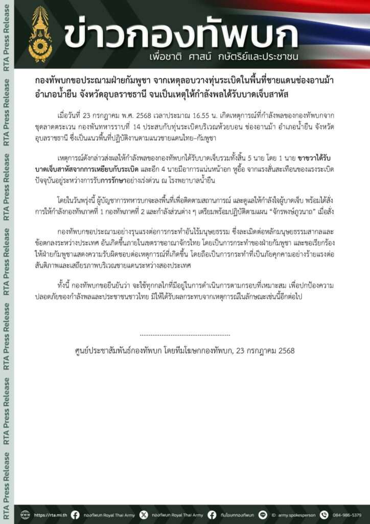 กองทัพบกขอประณามฝ่ายกัมพูชา จากเหตุลอบวางทุ่นระเบิดในพื้นที่ชายแดนช่องอานม้า อำเภอน้ำยืน จังหวัดอุบลราชธานี จนเป็นเหตุให้กำลังพลได้รับบาดเจ็บสาหัส