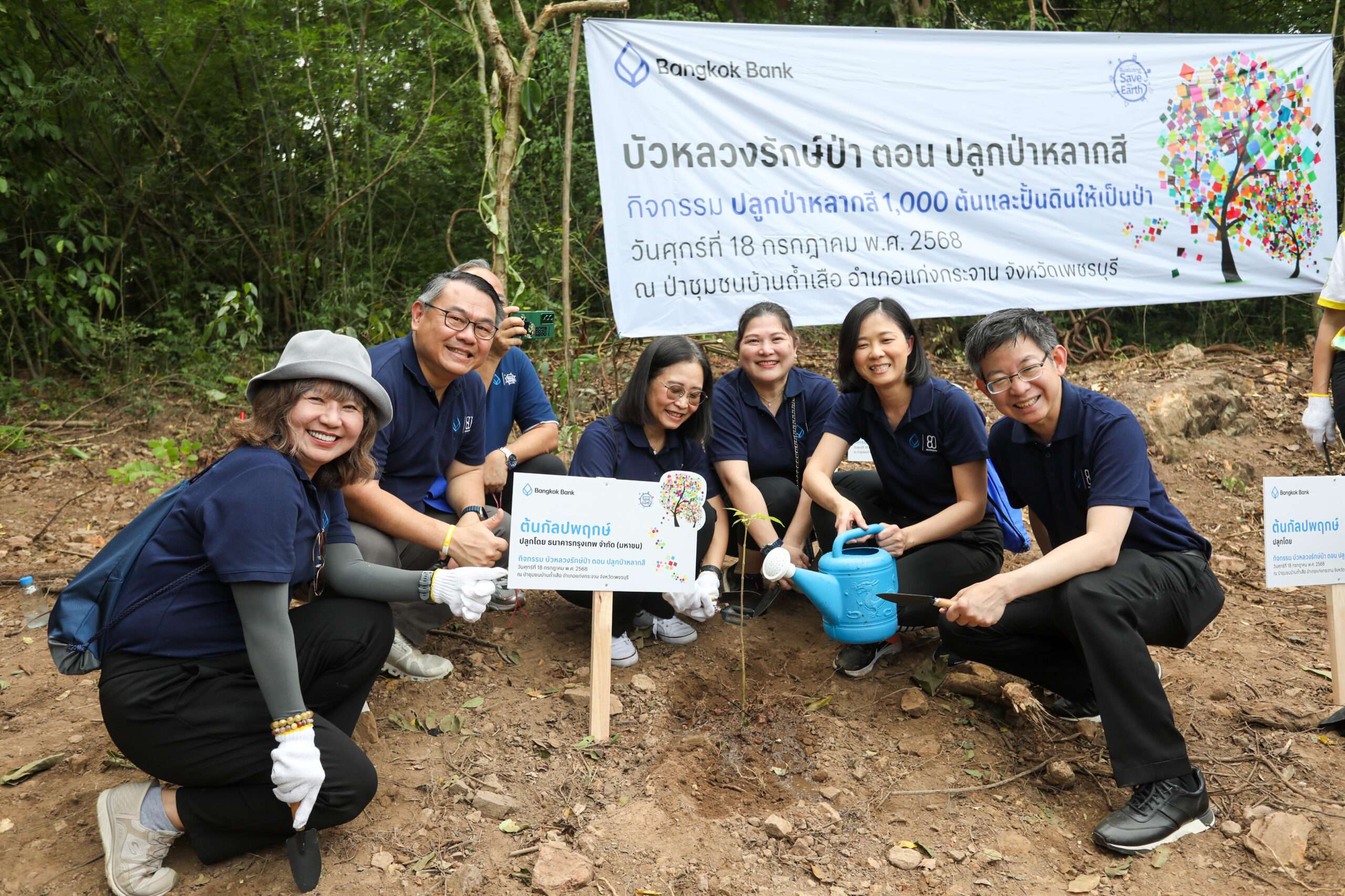 ธนาคารกรุงเทพ จำกัด (มหาชน) นำโดย นายกอบศักดิ์ ภูตระกูล กรรมการรองผู้จัดการใหญ่ (ที่ 6 จากซ้าย) นายอภิวัฒน์ ปุณโณปกรณ์ เจ้าหน้าที่บริหารระดับ Vice President ฝ่ายการประชาสัมพันธ์ (ที่ 3 จากขวา) นายสุวิทย์ อินทรเฉลิม เจ้าหน้าที่บริหารระดับ Vice Presidentฝ่ายการประชาสัมพันธ์ (ขวาสุด) นางสาวฐิติมา จิรเศรษฐสิริ เจ้าหน้าที่บริหารระดับ Vice President ฝ่ายผู้จัดการใหญ่ (ที่ 4 จากขวา) นายนิธิรุจน์ สิริรุจิพัฒน์ เจ้าหน้าที่บริหารระดับ Vice President ผู้จัดการภาคกลาง 3 (ที่ 2 จากขวา) ร่วมกับพันธมิตร นายรอยล จิตรดอน กรรมการและเลขาธิการมูลนิธิอุทกพัฒน์ ในพระบรมราชูปถัมภ์ (ที่ 5 จากซ้าย) นายกฤษดา สมประสงค์ ผู้อำนวยการสถาบันพัฒนาองค์กรชุมชน (องค์การมหาชน) (ที่ 6 จากขวา) นายชำนาญ สมบัตินิมิต (ที่ 5 จากขวา) ผู้อำนวยการสำนักจัดการทรัพยากรป่าไม้ที่ 10 สาขาเพชรบุรี นาวาโททรงกลด ปักษิณ ผู้บังคับหน่วยพัฒนาคุณภาพชีวิต หน่วยพัฒนาการเคลื่อนที่ 13 สำนักงานพัฒนาภาค 1 หน่วยบัญชาการทหารพัฒนา (ที่ 3 จากซ้าย) นายชูชาติ วรรณขำ ประธานคณะกรรมการเครือข่ายป่าชุมชนจังหวัดเพชรบุรี (ที่ 2 จากซ้าย) นายสุเทพ พิมพ์ศิริ คณะทํางานกรรมการจัดการป่าชุมชนบ้านถ้ำเสือ (ที่ 4 จากซ้าย) และ นายศิริรัตน์ กุลวัฒน์ ผู้ช่วยผู้ใหญ่บ้าน หมู่ 3 บ้านถ้ำเสือ (ซ้ายสุด) พร้อมด้วยเจ้าหน้าที่บริหาร พนักงานธนาคารกรุงเทพกลุ่ม Bualuang Green Team กลุ่มบัวหลวงจิตอาสา และชุมชนบ้านถ้ำเสือ รวมกว่า 150 คน จัดกิจกรรม “บัวหลวงรักษ์ป่า ตอน ปลูกป่าหลากสี” ปลูกพันธุ์ไม้จำนวน 1,000 ต้น บนพื้นที่ภูเขา เพื่อพัฒนาเป็นเส้นทางท่องเที่ยวศึกษาธรรมชาติป่าแก่งกระจานในอนาคต และเพิ่มความสมบูรณ์ให้ป่าด้วยกิจกรรมปั้นและยิงดินเมล็ดพันธุ์เพิ่มความหลากหลายของพืชพรรณ ณ ป่าชุมชนบ้านถ้ำเสือ อำเภอแก่งกระจาน จังหวัดเพชรบุรี โดยกิจกรรมนี้เป็นกิจกรรมภายใต้โครงการ Bualuang Save the Earth ที่ส่งเสริมและสนับสนุนกิจกรรมด้านสิ่งแวดล้อมของธนาคารกรุงเทพ เพื่อช่วยสร้างความตระหนักรู้ ปลูกฝังจิตสำนึกในการอนุรักษ์ทรัพยากรด้านป่าไม้ให้แก่พนักงานของธนาคาร ควบคู่ไปกับการสร้างความสัมพันธ์อันดีกับชุมชน ตามเจตนารมณ์ “เพื่อนคู่คิด มิตรคู่บ้าน” ที่พร้อมเคียงข้างสังคมในทุกมิติ