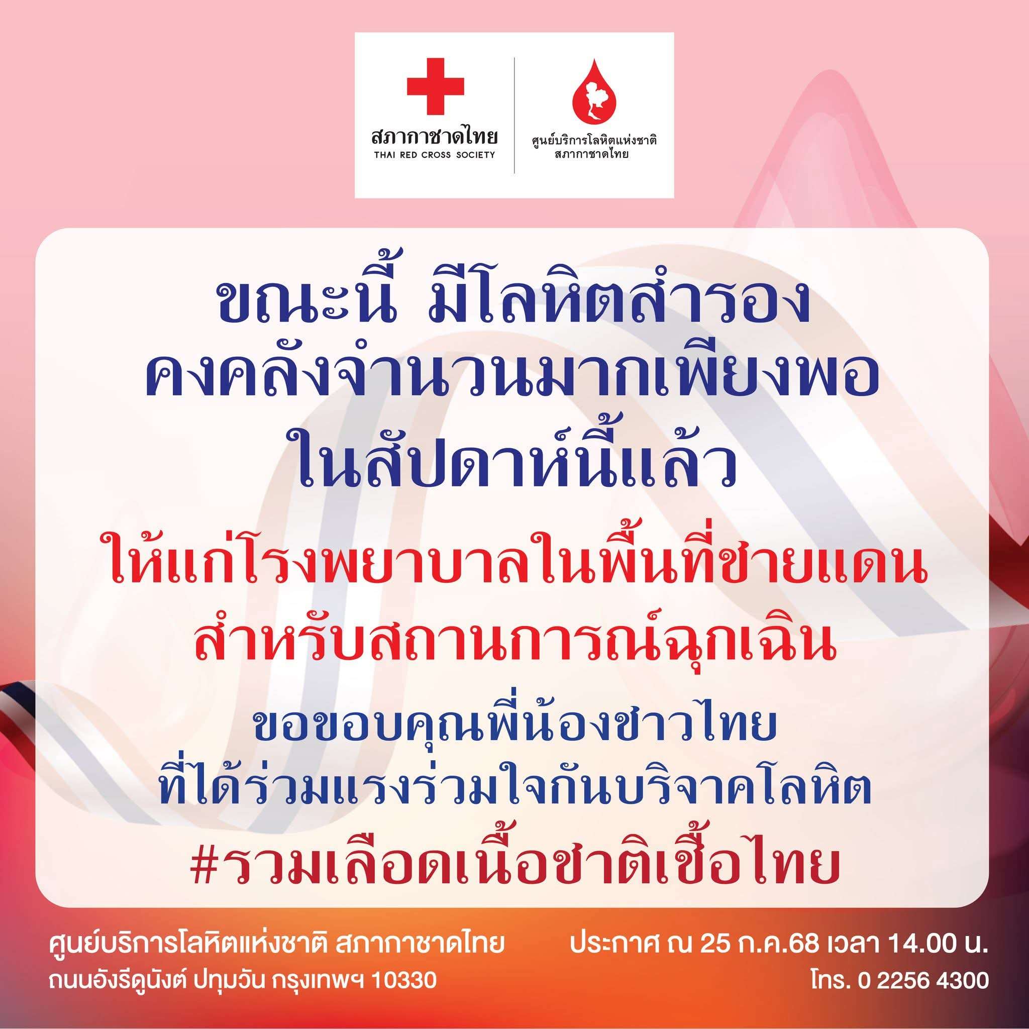 วันที่ 25 กรกฎาคม 2568 – ศูนย์บริการโลหิตแห่งชาติ สภากาชาดไทย ขอขอบคุณพี่น้องชาวไทยที่ร่วมแรงร่วมใจกันบริจาคโลหิตอย่างต่อเนื่อง เพื่อช่วยเหลือผู้ป่วยและสนับสนุนโรงพยาบาลในพื้นที่ชายแดน ได้แก่ จังหวัดสุรินทร์ ศรีสะเกษ อุบลราชธานี และบุรีรัมย์ ซึ่งได้รับผลกระทบจากสถานการณ์ความไม่สงบในช่วงที่ผ่านมา