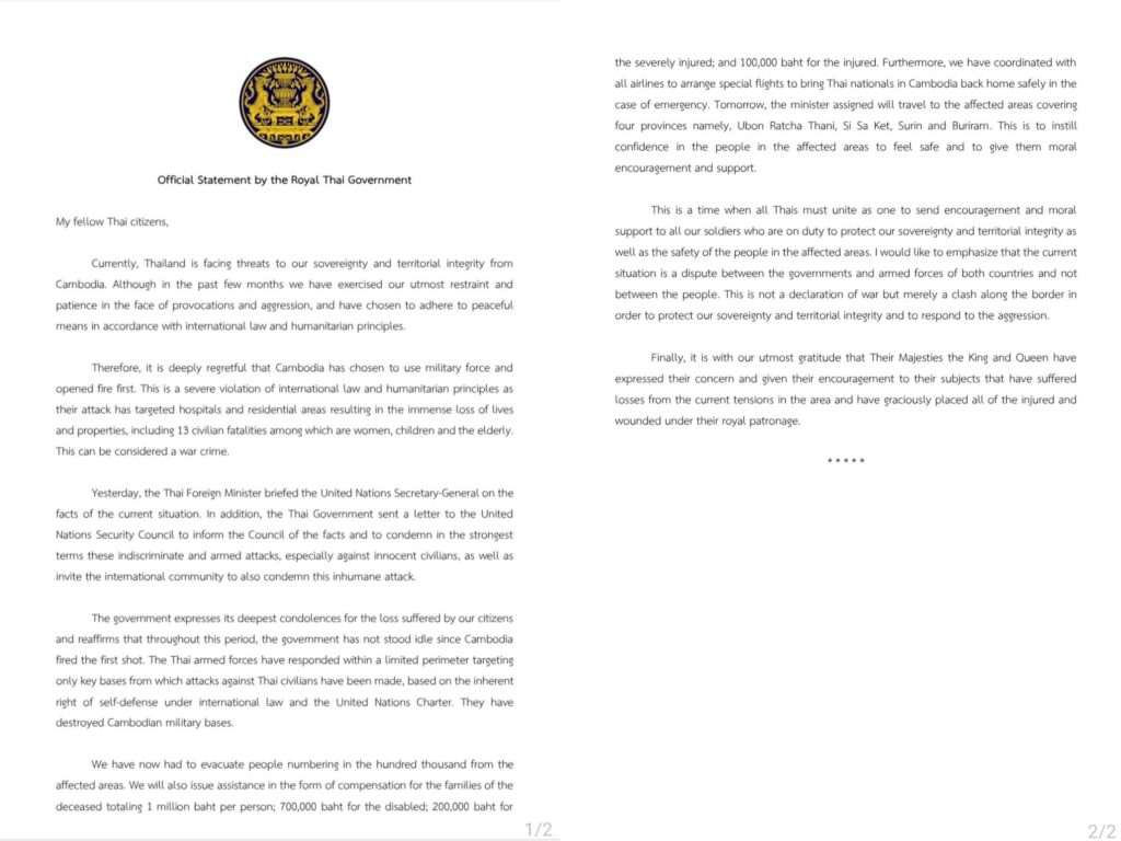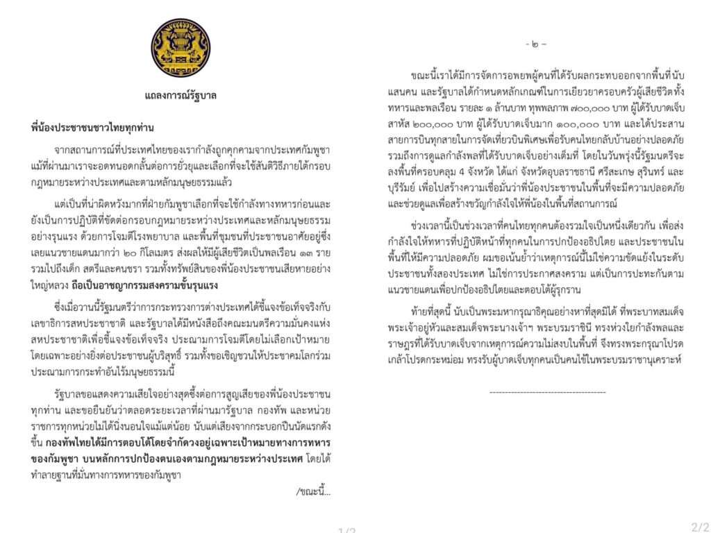 รัฐบาลขอแสดงความเสียใจอย่างสุดซึ้งต่อการสูญเสียของพี่น้องประชาชนทุกท่าน และขอยืนยันว่าตลอดระยะเวลาที่ผ่านมารัฐบาล กองทัพ และหน่วยราชการทุกหน่วยไม่ได้นิ่งนอนใจแม้แต่น้อย นับแต่เสียงจากกระบอกปืนนัดแรกดังขึ้น กองทัพไทยได้มีการตอบโต้โดยจำกัดวงอยู่เฉพาะเป้าหมายทางการทหารของกัมพูชา บนหลักการปกป้องตนเองตามกฎหมายระหว่างประเทศ โดยได้ทำลายฐานที่มั่นทางการทหารของกัมพูชา