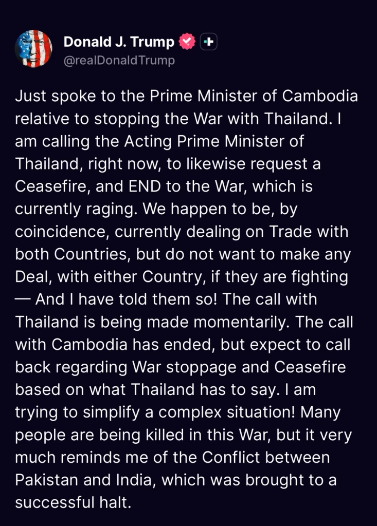 ประธานาธิบดีสหรัฐฯ ระบุว่าหลังจากที่ได้คุยกับนายภูมิธรรม และทราบว่าทางไทยต้องการให้มีการหยุดยิงโดยทันที และต้องการสันติภาพ เขาจะติดต่อกลับไปหาฮุน มาเนตเพื่อบอกข้อความของฝั่งไทยให้ทราบ “หลังจากได้พูดคุยกับทั้งสองฝ่ายแล้ว การหยุดยิง สันติภาพ และความมั่งคั่ง ดูเหมือนจะเป็นหนทางที่เป็นธรรมชาติ เราจะได้เห็นกันในเร็ว ๆ นี้!”
