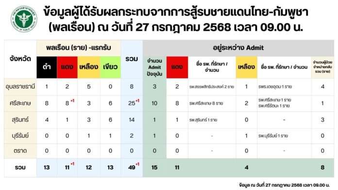 ดร.นพ.วรตม์ โชติพิทยสุนนท์ โฆษกกระทรวงสาธารณสุข เปิดเผยข้อมูลล่าสุดผู้ได้รับผลกระทบในกลุ่มพลเรือน มีผู้เสียชีวิต 13 ราย บาดเจ็บสาหัส 11 ราย บาดเจ็บปานกลาง 12 ราย และบาดเจ็บเล็กน้อย 13 ราย รวมทั้งหมด 49 ราย โดยในจำนวนนี้ยังมีผู้ป่วยที่ยังรับการรักษาในโรงพยาบาล 15 ราย ส่วนผู้ที่อาการดีขึ้นและกลับบ้านได้แล้ว 8 ราย