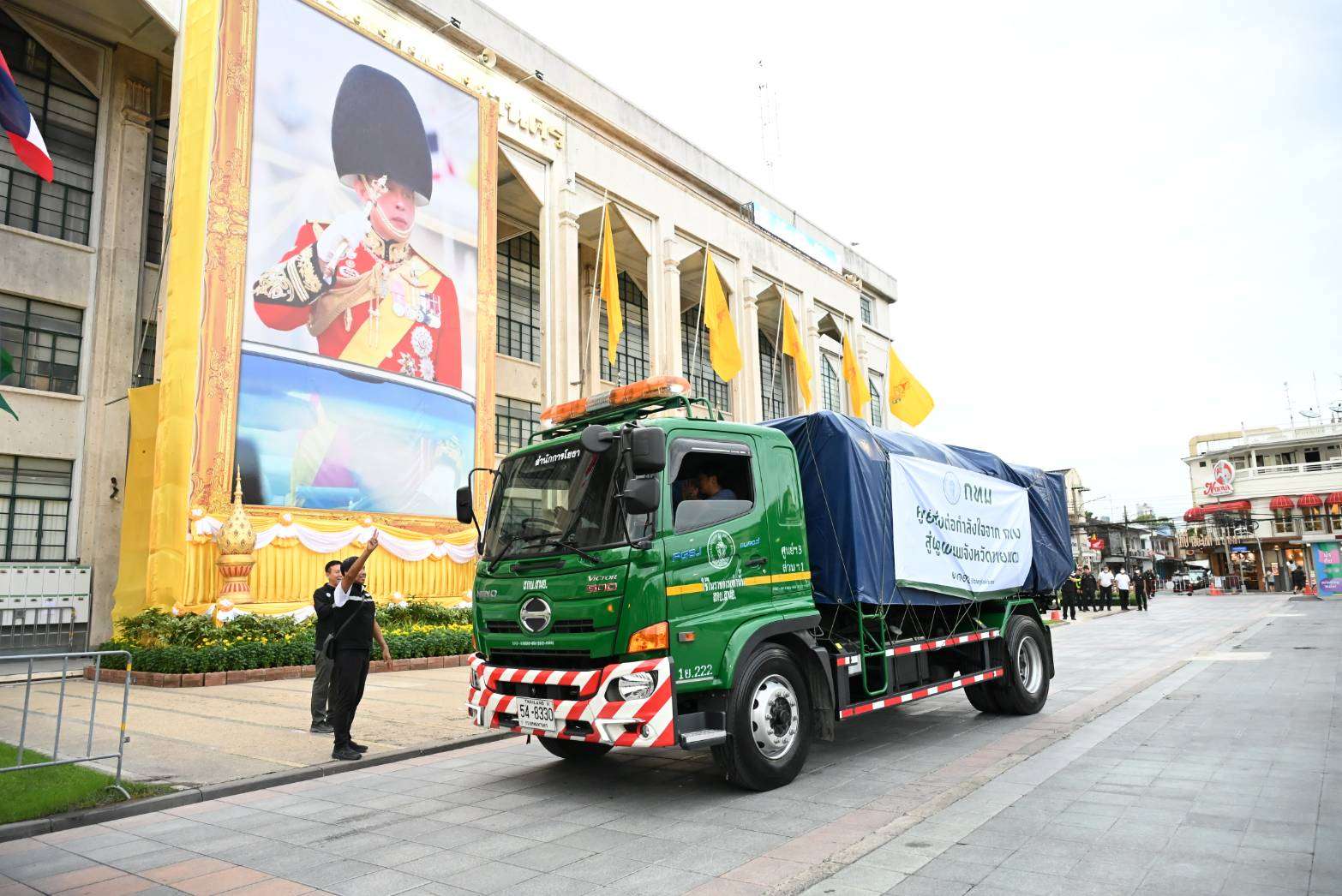 ” ขณะนี้เรากำลังจะขนของไปที่แนวหน้า จำนวน 2 คัน ซึ่งรถบรรทุกบรรจุของบริจาคเต็ม แล้ว 1 คันรถ นี่เป็นอีกหนึ่งคันรถที่กำลังบรรจุของขึ้นรถบรรทุกซึ่งน่าจะพร้อมออกเดินทางอีกประมาณ 1 ชั่วโมงข้างหน้า โดยเป็นรถของสำนักการโยธา กรุงเทพมหานคร ที่เคยใช้ในภารกิจขนซากปูน ซากเหล็ก จากอาคาร สตง.ถล่ม เมื่อครั้งเกิดเหตุแผ่นดินไหวที่ผ่านมา รวมถึงไปช่วยเหลือประชาชนจากเหตุ ดินโคลนถล่มที่เชียงรายอีกด้วยโดยรถแต่ละคันจะมีคนขับคันละ 2 คน” ผู้ว่าฯ ชัชชาติ กล่าว