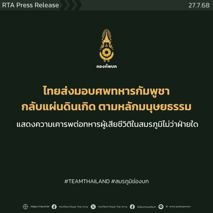 เมื่อวันที่ 27 กรกฎาคม 2568 เวลา 16.30 น. เจ้าหน้าที่ฝ่ายไทยได้ดำเนินการส่งมอบศพทหารกัมพูชา จำนวน 12 นาย ซึ่งเสียชีวิตจากการสู้รบในพื้นที่ภูมะเขือ ให้แก่เจ้าหน้าที่ฝ่ายกัมพูชา ณ จุดผ่านแดนถาวรช่องสะงำ ตำบลไพรพัฒนา อำเภอภูสิงห์ จังหวัดศรีสะเกษ เพื่อนำศพกลับไปประกอบพิธีทางศาสนาในภูมิลำเนาต่อไป
