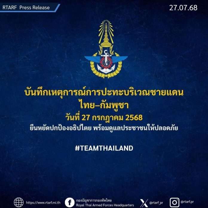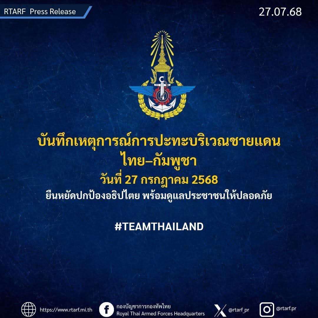 The Royal Thai Armed Forces extend their deepest condolences to the families of those who lost their lives and to all individuals affected by Cambodia’s violation of Thailand’s sovereignty. We strongly condemn the indiscriminate use of weapons, which constitutes a blatant violation of international law and fundamental humanitarian principles.