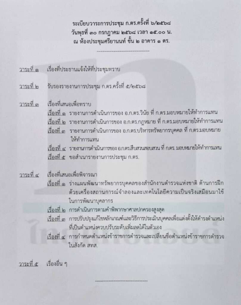 ที่สำนักงานตำรวจแห่งชาติ (ตร.) มีรายงานว่า นายภูมิธรรม เวชยชัย รักษาการนายกรัฐมนตรีไทย ในฐานะประธานคณะกรรมการข้าราชการตำรวจ (ก.ตร.) นัดประชุม ก.ตร.ครั้งที่ 6/2568 ในวันที่ 30 ก.ค.2568 เวลา 15.00 น. ณ ห้องประชุมศรียานนท์ ชั้น 2 อาคาร 1 ตร. โดยมีระเบียบวาระการประชุม 5 วาระ ประกอบด้วย