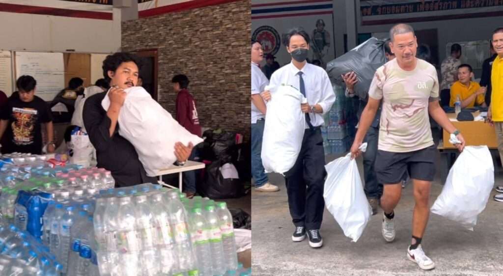 จากนั้นได้เดินทางไปยังศูนย์รับบริจาคสิ่งของ กองร้อย อส. ศาลากลางจังหวัดนนทบุรี เพื่อส่งมอบข้าวสาร อาหารแห้ง และน้ำดื่ม พร้อมลงแรงเป็นจิตอาสาช่วยเจ้าหน้าที่รับของบริจาคจากประชาชน โดยร่วมกับนายวสันต์ ขาวสงค์ต์ ป้องกันจังหวัดนนทบุรี และทีมงานในการจัดเรียง ยกของ และคัดแยกสิ่งของ เพื่อเตรียมส่งต่อไปยังพื้นที่ประสบภัย