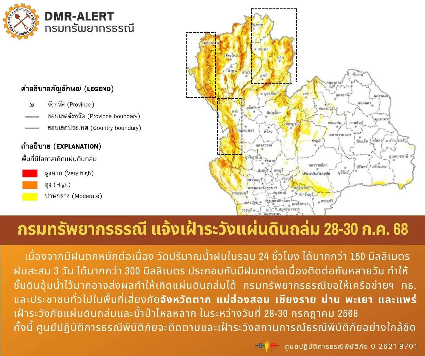 กรุงเทพฯ, วันที่ 28 ก.ค. – กรมทรัพยากรธรณี กระทรวงทรัพยากรธรรมชาติและสิ่งแวดล้อม ประกาศแจ้งเตือนขอให้อาสาสมัครเครือข่ายในพื้นที่จังหวัดตาก แม่ฮ่องสอน เชียงราย น่าน พะเยา และแพร่ เฝ้าระวังภัยแผ่นดินถล่มและน้ำป่าไหลหลาก ในระหว่างวันที่ 28-30 กรกฎาคม 2568 และขอให้เครือข่ายฯ ทธ. วัดปริมาณน้ำฝนอย่างต่อเนื่อง ทั้งนี้ ศูนย์ปฏิบัติการธรณีพิบัติภัย จะติดตามสถานการณ์อย่างใกล้ชิด