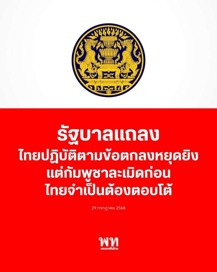 รัฐบาลไทย แถลงยืนยันความจริงใจและความพยายามในการยุติสถานการณ์ปะทะตามแนวชายแดนไทย-กัมพูชาโดยเร็วที่สุด โดยยึดหลักประโยชน์ของประชาชน อธิปไตยของชาติ และความปลอดภัยของทหารและพลเรือนเป็นสำคัญ พร้อมปฏิบัติตามข้อตกลงหยุดยิงที่เมืองปูตราจายา ประเทศมาเลเซีย อย่างเคร่งครัด แต่ปรากฏว่ากองกำลังกัมพูชาละเมิดข้อตกลง โดยใช้อาวุธโจมตีทหารไทยในหลายพื้นที่ ทำให้ไทยจำเป็นต้องตอบโต้ด้วยมาตรการที่เด็ดขาดและเหมาะสม เพื่อปกป้องอธิปไตยและชีวิตของประชาชนผู้บริสุทธิ์