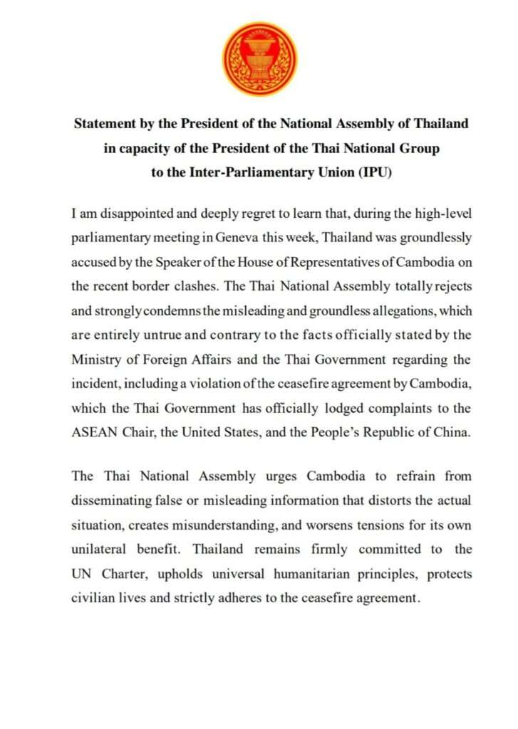 นายวันมูหะมัดนอร์ มะทา ประธานรัฐสภาและประธานสภาผู้แทนราษฎร ในฐานะประธานหน่วยประจำชาติไทยในสหภาพรัฐสภา (Inter-Parliamentary Union: IPU) กล่าวถ้อยแถลงต่อเหตุการณ์ปะทะระหว่างไทยและกัมพูชา ว่า รู้สึกเสียใจและผิดหวังอย่างยิ่งที่ได้รับทราบว่าในระหว่างการประชุมระดับสูงของสหภาพรัฐสภา ณ นครเจนีวา สมาพันธรัฐสวิส ในสัปดาห์นี้ ประเทศไทยถูกกล่าวหาจากประธานสภาผู้แทนราษฎรกัมพูชา โดยปราศจากมูลความจริงเกี่ยวกับเหตุการณ์ปะทะบริเวณชายแดนเมื่อเร็ว ๆ นี้ รวมถึงมีการละเมิดข้อตกลงหยุดยิงของกัมพูชา รัฐบาลไทยได้ฟ้องไปยังประธานอาเซียน ผู้นำสหรัฐอเมริกา และผู้นำจีนแล้ว