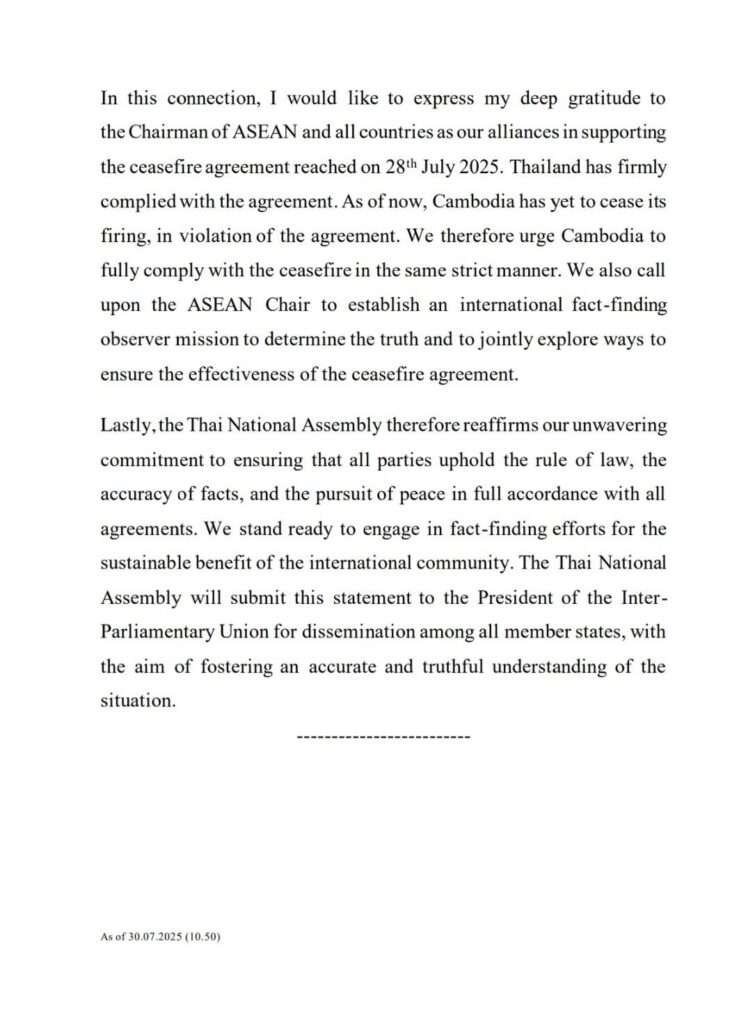 รัฐสภาไทย ขอเรียกร้องให้ประเทศกัมพูชาหยุดการเผยแพร่ข้อมูลอันเป็นเท็จหรือบิดเบือนข้อเท็จจริง ซึ่งอาจสร้างความเข้าใจผิดและซ้ำเติมสถานการณ์ให้เลวร้ายลง เพื่อประโยชน์ฝ่ายเดียว ประเทศไทยยังคงยึดมั่นในกฎบัตรสหประชาชาติ หลักมนุษยธรรมสากล และการคุ้มครองชีวิตพลเรือนและข้อตกลงหยุดยิงอย่างเคร่งครัด