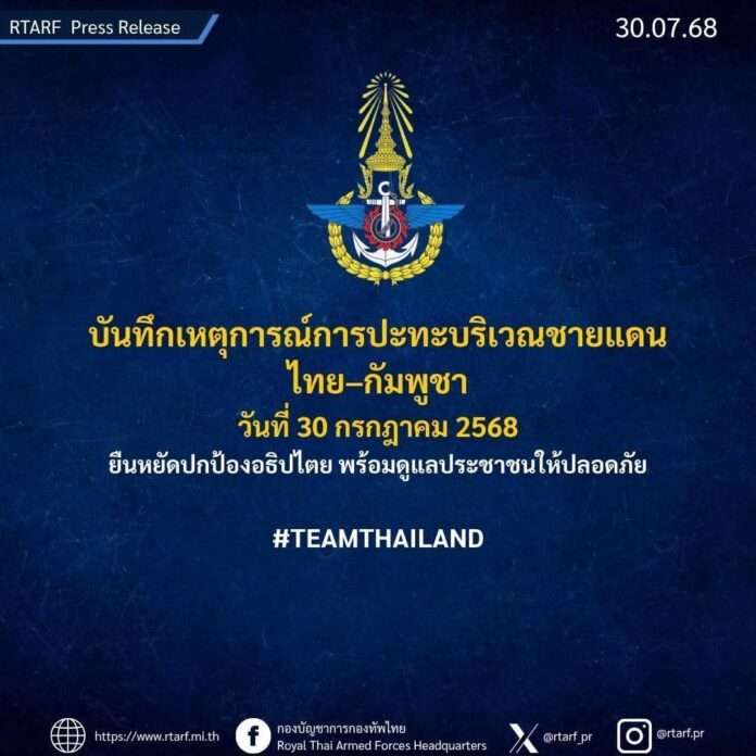 At 10.00 hrs, the Royal Thai Army issued a statement condemning Cambodia’s repeated violations of the ceasefire agreement, which has been in effect since 24.00 hrs of 28 July 2025. Despite Thailand’s strict compliance and suspension of all military actions in good faith, Cambodian forces violated the agreement as follows: