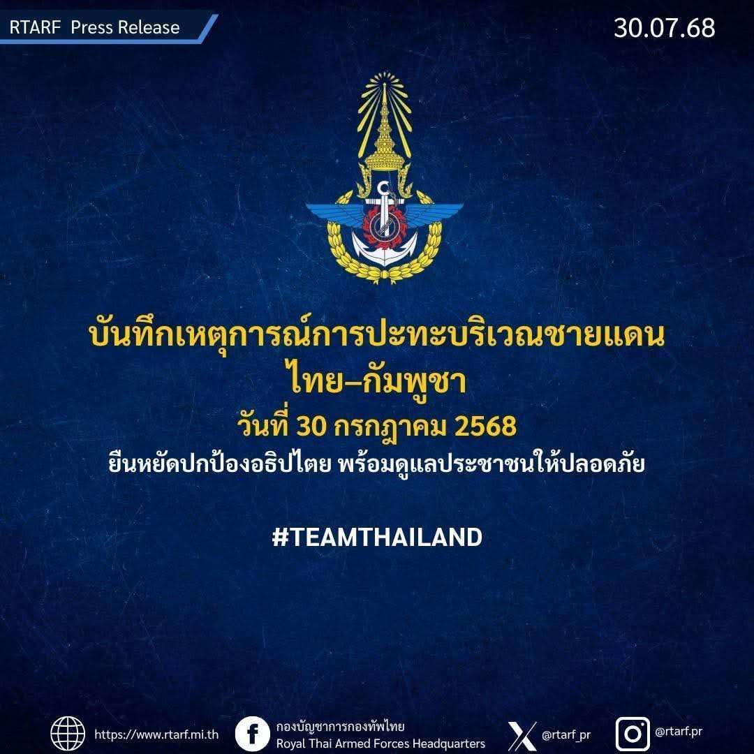 เวลา 10.00 น. มีแถลงการณ์จากกองทัพบก เรื่องการละเมิดข้อตกลงหยุดยิงโดยกองทัพกัมพูชา จากข้อตกลงร่วมกันในการหยุดยิง ตั้งแต่เวลา 24.00 น.วันที่ 28 ก.ค.68 กองทัพบกปฏิบัติตามข้อตกลงอย่างเคร่งครัด โดยได้ระงับการใช้กำลังทุกรูปแบบ เพื่อให้เกิดสันติภาพทั้ง 2 ประเทศ แต่พบว่าฝ่ายกัมพูชาโด้กระทำละเมิดข้อตกลงในวันที่ 29-30 ก.ค.68 ในพื้นที่ดังต่อไปนี้