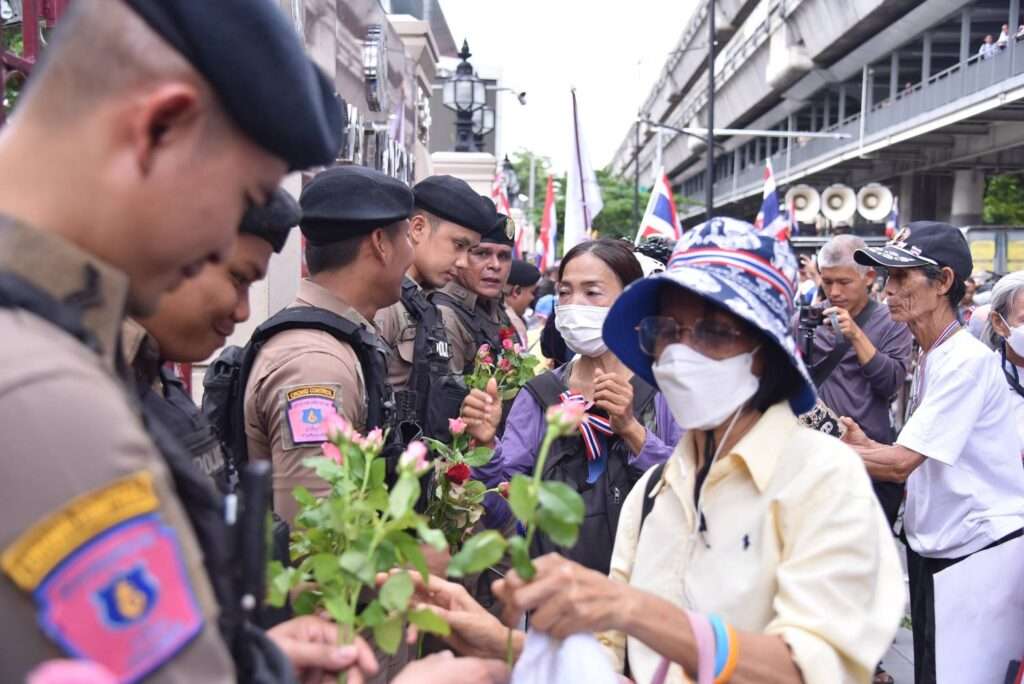 การชุมนุมในวันนี้มีแกนนำสำคัญ อาทิ นายพิชิต ไชยมงคล นายจตุพร พรหมพันธุ์ และนายนิติธร ล้ำเหลือ พร้อมมวลชนที่นำธงชาติไทย ป้ายข้อความ และดอกกุหลาบมามอบให้กำลังใจเจ้าหน้าที่ ท่ามกลางสภาพอากาศร้อนจัด โดยมีการผลัดกันขึ้นเวทีปราศรัย สนับสนุนบทบาทของตำรวจในการรักษาความสงบเรียบร้อย และวิพากษ์วิจารณ์การทำงานของรัฐบาล