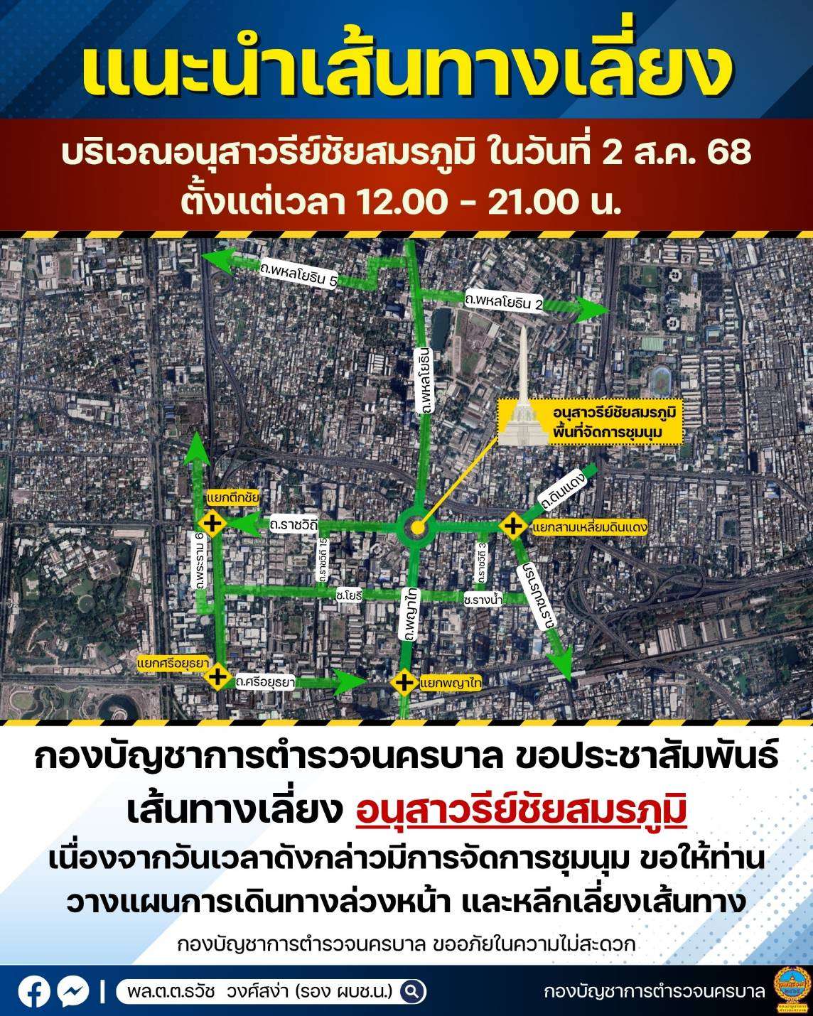 นครบาล แนะเส้นทางลี่ยง “อนุสาวรีย์ชัยฯ” 2 ส.ค.68 เหตุมีชุมนุมใหญ่