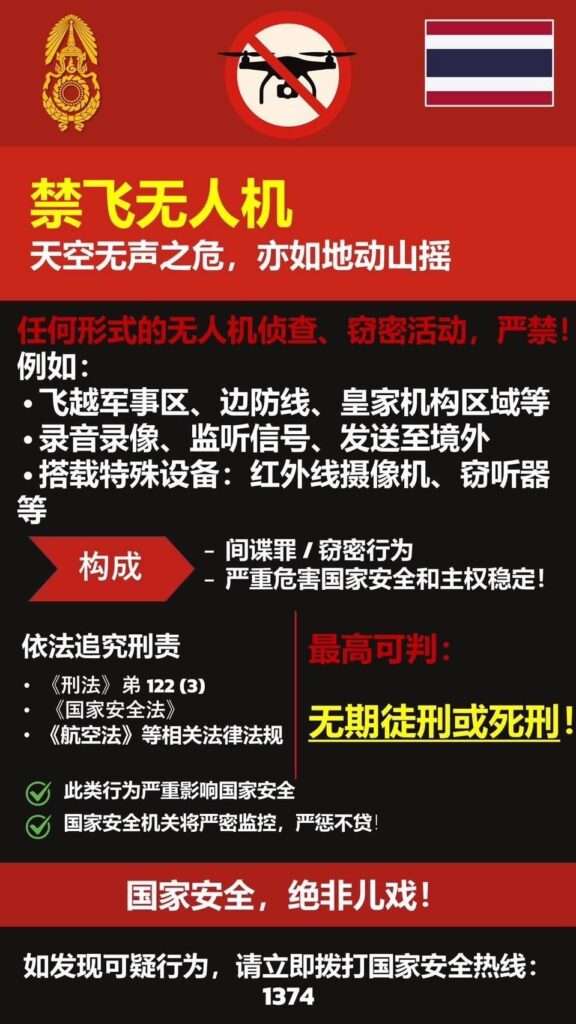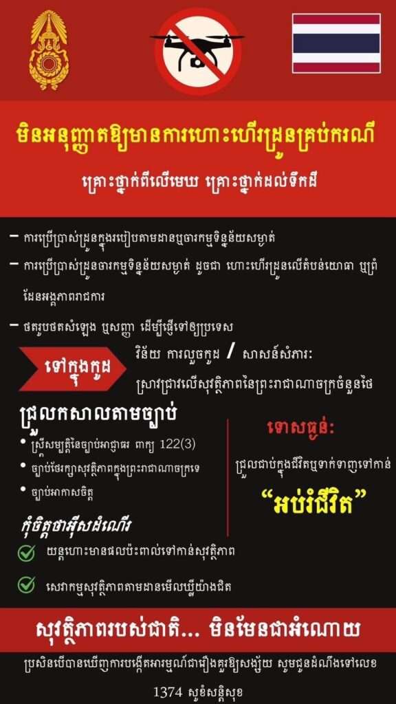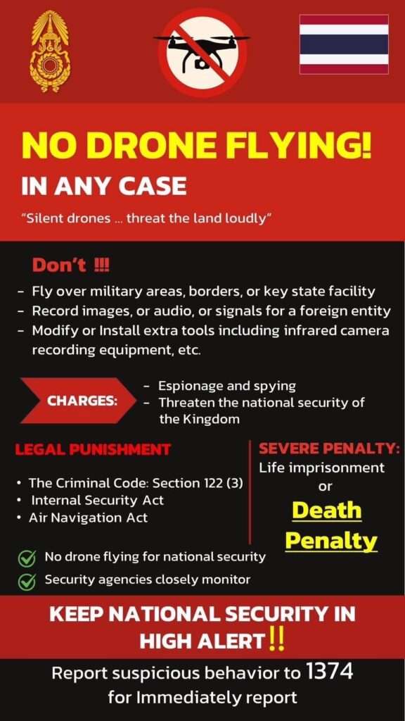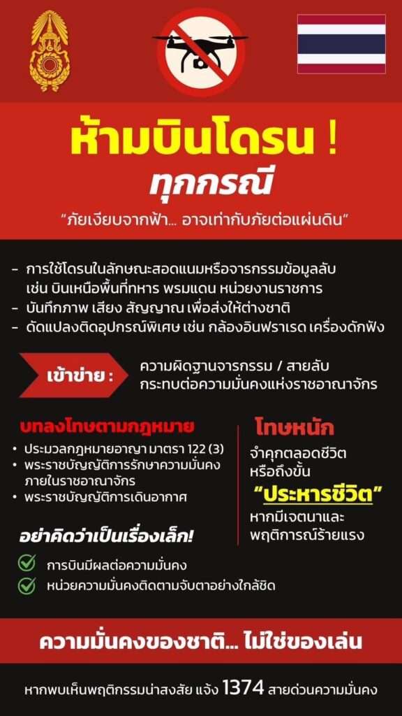 ตามที่สำนักงานการบินพลเรือนแห่งประเทศไทย ได้ออกประกาศ เมื่อวันที่ 29 กรกฎาคม พ.ศ. 2568 เรื่องห้ามมิให้ผู้ใดบังคับหรือปล่อยอากาศยานซึ่งไม่มีนักบิน หรือ “โดรน” ที่ควบคุมการบินจากภายนอก, ทุกวัตถุประสงค์การใช้งาน, และทุกพื้นที่ทั่วราชอาณาจักรโดยเด็ดขาด เพื่อป้องกันผลกระทบต่อความมั่นคงของประเทศจากสถานการณ์ชายแดนไทย–กัมพูชาในปัจจุบัน.ทั้งนี้ เจ้าหน้าที่ฝ่ายทหารหรือหน่วยงานด้านความมั่นคงที่ได้รับมอบหมาย มีอำนาจในการใช้ระบบต่อต้านโดรน (Anti-Drone System) รวมถึงสามารถดำเนินการทำลายโดรนจากภาคพื้นดินได้ทันที