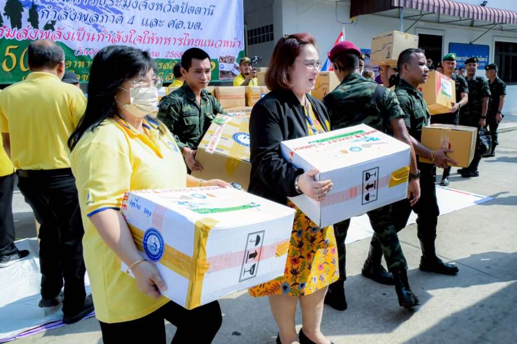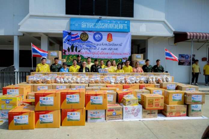 ที่สมาคมการประมงจังหวัดปัตตานี, วันที่ 1 สิงหาคม – พลโท ไพศาล หนูสังข์ แม่ทัพภาคที่ 4 และผู้อำนวยการรักษาความมั่นคงภายในภาค 4 พร้อมคณะผู้บังคับบัญชาและภาคีเครือข่าย นำโดย นายนันทพงศ์ สุวรรณรัตน์ รองเลขาธิการศูนย์อำนวยการบริหารจังหวัดชายแดนภาคใต้ (ศอ.บต.), คุณอันน์เกตุ ลีลาไพบูลย์ นายกสมาคมการประมงจังหวัดปัตตานี, นายวีระ ศรีชัย หัวหน้าท่าเทียบเรือประมงปัตตานี และน้ำใจจากพี่น้องประชาชนชายแดนใต้ ร่วมส่งธารน้ำใจ ผ่านเครื่องอุปโภค บริโภค ข้าวสาร อาหารแห้ง จำนวนกว่า 1,000 ชุด และอาหารทะเลอบแห้งกว่า 5,000 ชุด โดยลำเลียงด้วยรถยนต์บรรทุกขนาดใหญ่ จากมณฑลทหารบกที่ 46 ไปยังมณฑลทหารบกที่ 25 ค่ายวีรวัฒน์โยธิน อำเภอเมือง จังหวัดสุรินทร์ ส่งตรงถึงมือสนับสนุนการปฏิบัติภารกิจของทหารหาญที่อยู่แนวหน้า รวมถึงพี่น้องประชาชนในพื้นที่ชายแดนที่ต้องอพยพออกจากบ้านเรือนไปอยู่ศูนย์พักพิงเพื่อความปลอดภัย