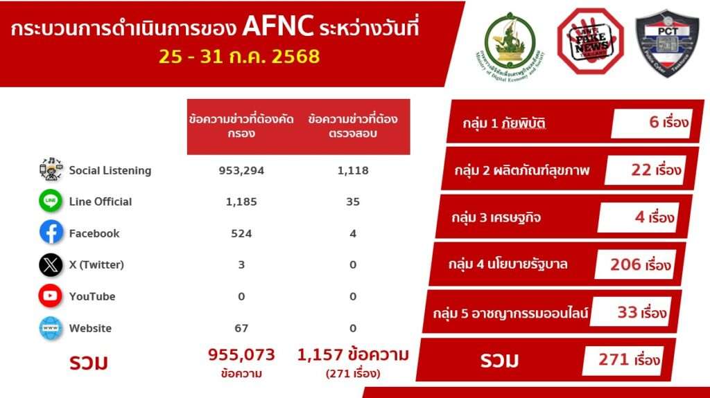 กรุงเทพฯ, วันที่ 2 ส.ค. – นายเวทางค์ พ่วงทรัพย์ เลขาธิการคณะกรรมการดิจิทัลเพื่อเศรษฐกิจและสังคมแห่งชาติ (BDE) ในฐานะโฆษกกระทรวงดิจิทัลเพื่อเศรษฐกิจและสังคม (ดีอี) กล่าวถึงผลการมอนิเตอร์และรับแจ้งข่าวปลอมของศูนย์ต่อต้านข่าวปลอม ระหว่างวันที่ 25 – 31 กรกฎาคม 2568 พบข้อความที่เข้ามาทั้งหมด 955,073 ข้อความ โดยมีข้อความที่ต้องดำเนินการตรวจสอบ (Verify) ทั้งสิ้น 1,157 ข้อความ โดยแบ่งข่าวปลอมเป็น 5 กลุ่มหลัก ประกอบด้วย 1) นโยบายรัฐบาล ข่าวราชการ ฯลฯ จำนวน 206 เรื่อง 2) : ผลิตภัณฑ์สุขภาพ เครื่องสำอาง สินค้าและบริการที่ผิดกฎหมาย จำนวน 22 เรื่อง 3) ภัยพิบัติ จำนวน 6 เรื่อง 4) เศรษฐกิจ จำนวน 4 เรื่อง และ 5) กลุ่มอาชญากรรมออนไลน์ จำนวน 33 เรื่อง