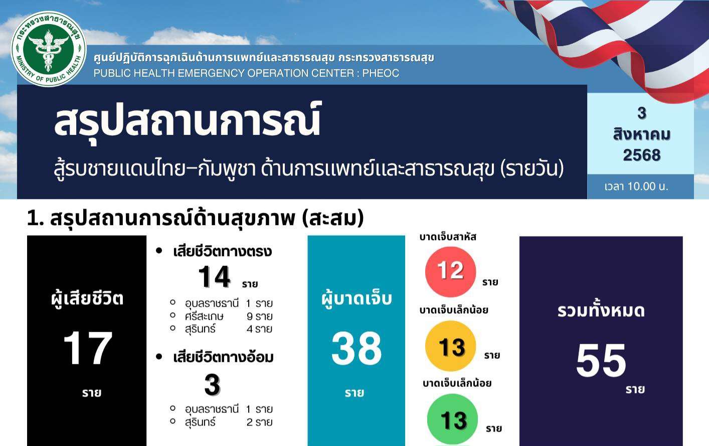 เมื่อเวลา 10.00 น. วันที่ 3 สิงหาคม 2568 มีการรายงานความคืบหน้าเกี่ยวกับสถานการณ์พื้นที่ประสบภัยในภาคตะวันออกเฉียงเหนือ โดยมีรายละเอียดสำคัญ ดังนี้