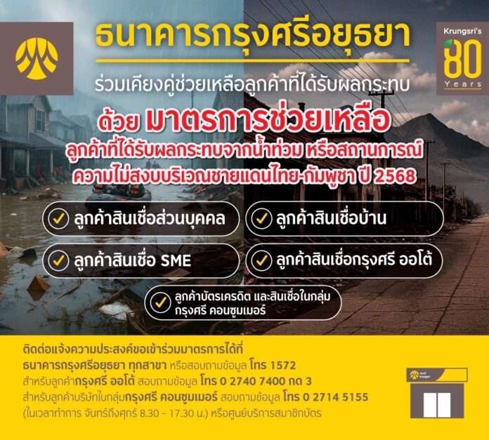 กรุงศรี (ธนาคารกรุงศรีอยุธยา จำกัด (มหาชน) และบริษัทในเครือ) ออกมาตรการเร่งด่วนเพื่อช่วยเหลือลูกค้ากรุงศรี ครอบคลุมทั้งลูกค้าบุคคล และลูกค้าธุรกิจ SME ที่ได้รับผลกระทบจากสถานการณ์อุทกภัยฉับพลันจากอิทธิพลของพายุโซนร้อนวิภา และสถานการณ์ความไม่สงบบริเวณชายแดน