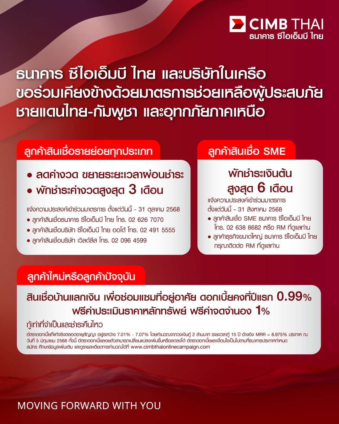 ธนาคาร ซีไอเอ็มบี ไทย และบริษัทในเครือ ร่วมเคียงข้างผู้ได้รับผลกระทบจากสถานการณ์ชายแดนไทย-กัมพูชา และอุทกภัยในพื้นที่ภาคเหนือของไทย ออกมาตรการช่วยเหลือเพื่อบรรเทาความเดือดร้อนของลูกค้าในช่วงเวลาที่ยากลำบากนี้