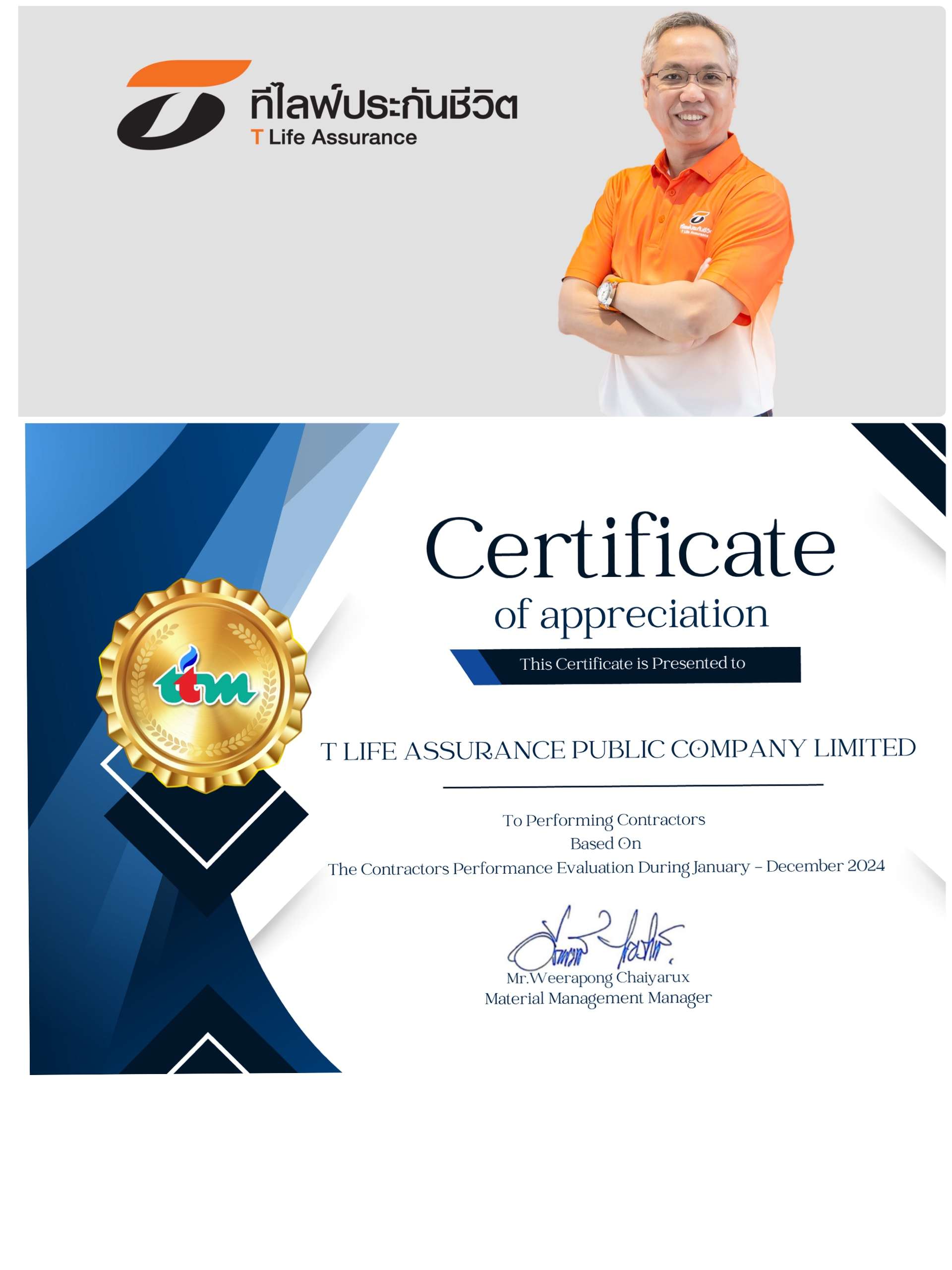 นายวุฒิเลิศ สุวรรณศรี กรรมการผู้จัดการ บริษัท ที ไลฟ์ ประกันชีวิต จำกัด (มหาชน) กล่าวว่า “ตลอดปีที่ผ่านมา ที ไลฟ์ ประกันชีวิต ได้ให้บริการประกันชีวิตกลุ่ม (Group Insurance) แก่ ทีทีเอ็ม โดยมอบความคุ้มครองกรณีเสียชีวิตสำหรับพนักงาน ซึ่งการได้รับประกาศนียบัตรในครั้งนี้ สะท้อนถึงความมุ่งมั่นในการดำเนินงานด้วยความเป็นมืออาชีพและมีประสิทธิภาพอย่างต่อเนื่อง”