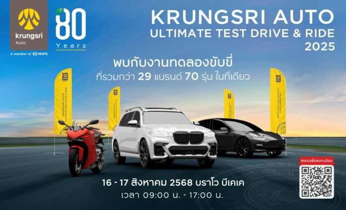 ลูกค้าปัจจุบัน กรุงศรี ออโต้ และผู้ที่สนใจสามารถเข้าร่วมงาน “Krungsri Auto Ultimate Test Drive & Ride 2025” ได้ระหว่างวันที่ 16 – 17 สิงหาคม 2568 เวลา 09:00 – 17:00 น. ณ บราโว บีเคเค (Bravo BKK) โดยสามารถลงทะเบียนเข้าร่วมงานได้ ตั้งแต่วันที่ 30 กรกฎาคม – 13 สิงหาคม 2568 ติดตามรายละเอียดเพิ่มเติมได้ที่ https://www.krungsriauto.com/auto/Promotion/ultimate_testdrive.html