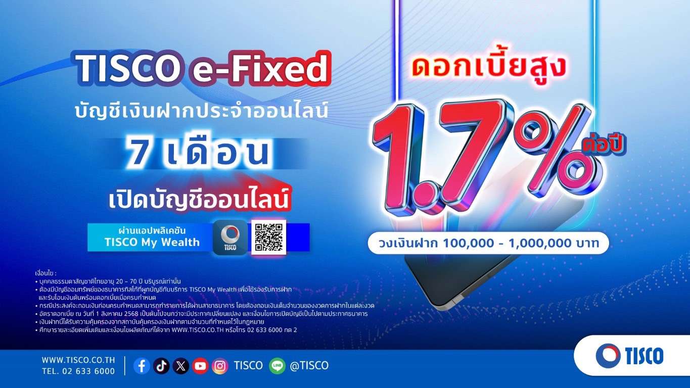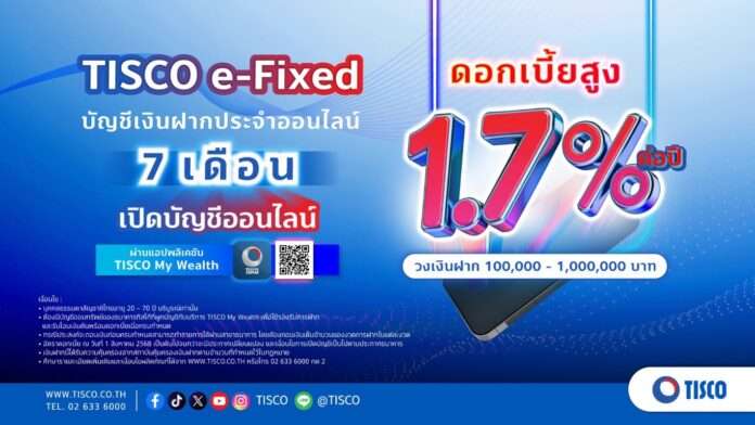 ธนาคารทิสโก้ จำกัด (มหาชน) เอาใจคนชอบดอกเบี้ยสูง ! เสิร์ฟบัญชีเงินฝากประจำออนไลน์ 7 เดือน “TISCO e-Fixed” ดอกเบี้ยสูง 1.7% ต่อปี วงเงินฝาก 100,000 – 1,000,000 บาท เปิดบัญชีออนไลน์ได้เลยไม่ต้องไปสาขา ! ผ่านแอปพลิเคชัน TISCO My Wealth คลิก https://link.tisco.co.th/ccBVHU
