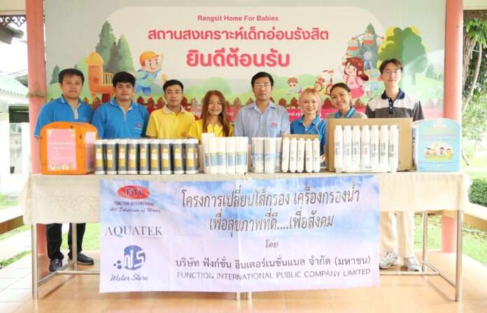 สถานสงเคราะห์เด็กอ่อนรังสิต จ.ปทุมธานี, วันที่ 5 ส.ค. นายวรรณรัตน์ รัตนปัญญา ผู้จัดการฝ่ายการตลาด บริษัท ฟังก์ชั่น อินเตอร์เนชั่นแนล จำกัด (มหาชน) หรือ FTI พร้อมด้วยทีมงาน ได้ดำเนินการเปลี่ยนไส้กรอง และตรวจเช็คเครื่องกรองน้ำอย่างละเอียด ตาม “โครงการเปลี่ยนไส้กรองเครื่องกรองน้ำ เพื่อสุขภาพที่ดี เพื่อสังคม” โดยมีเป้าหมายเพื่อยกระดับคุณภาพชีวิตของเด็กและเจ้าหน้าที่ในสถานสงเคราะห์ผ่านการดูแลระบบน้ำดื่มอย่างมีประสิทธิภาพ